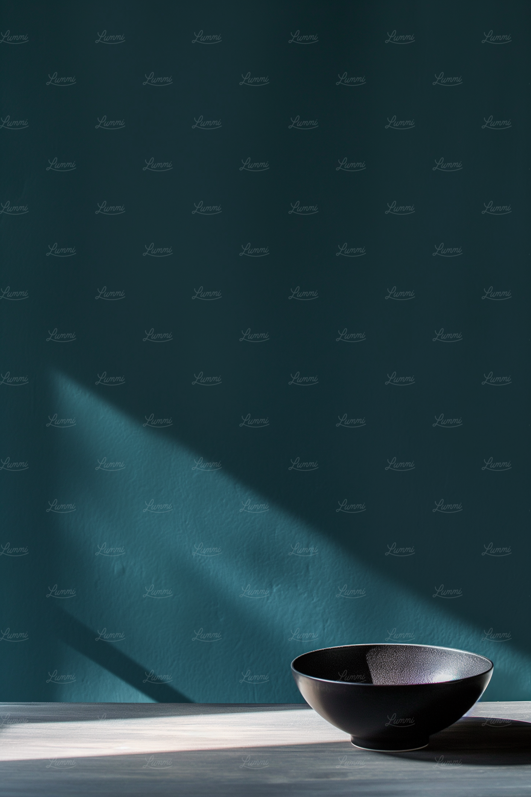 Minimalist black bowl on a light surface with teal wall and soft shadows, creating a serene and modern aesthetic.