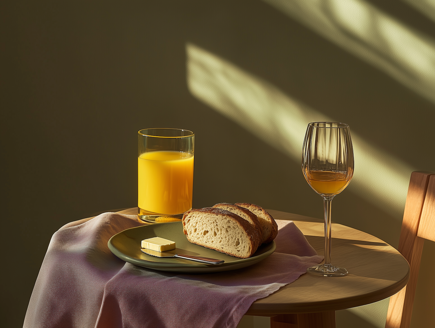 Minimalist breakfast setup with bread, butter, orange juice, and wine glass on a wooden table in warm sunlight.