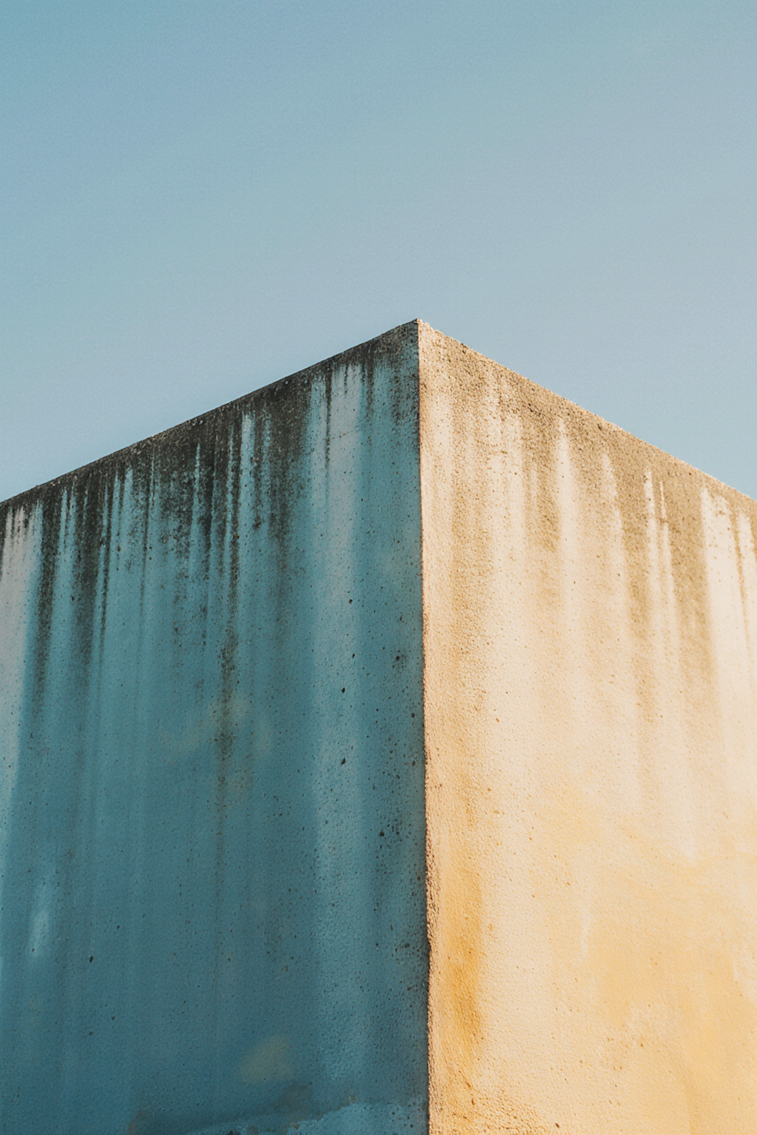 Minimalist photo of a building corner with blue and yellow walls under a clear sky, showcasing texture and geometric simplicity.