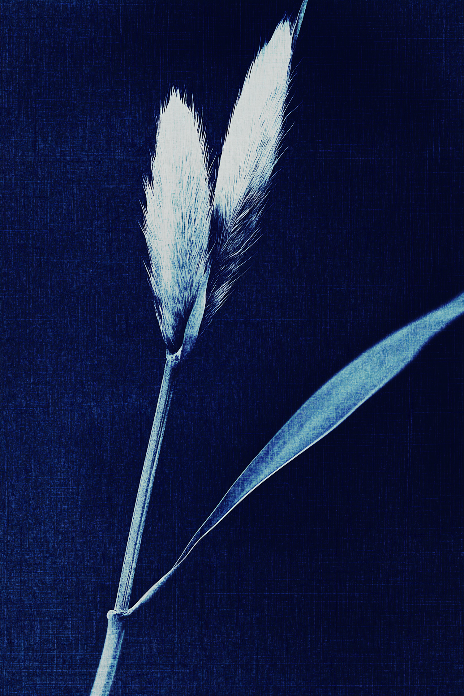 Close-up of fluffy seed heads against a dark blue background, creating a striking monochromatic contrast.