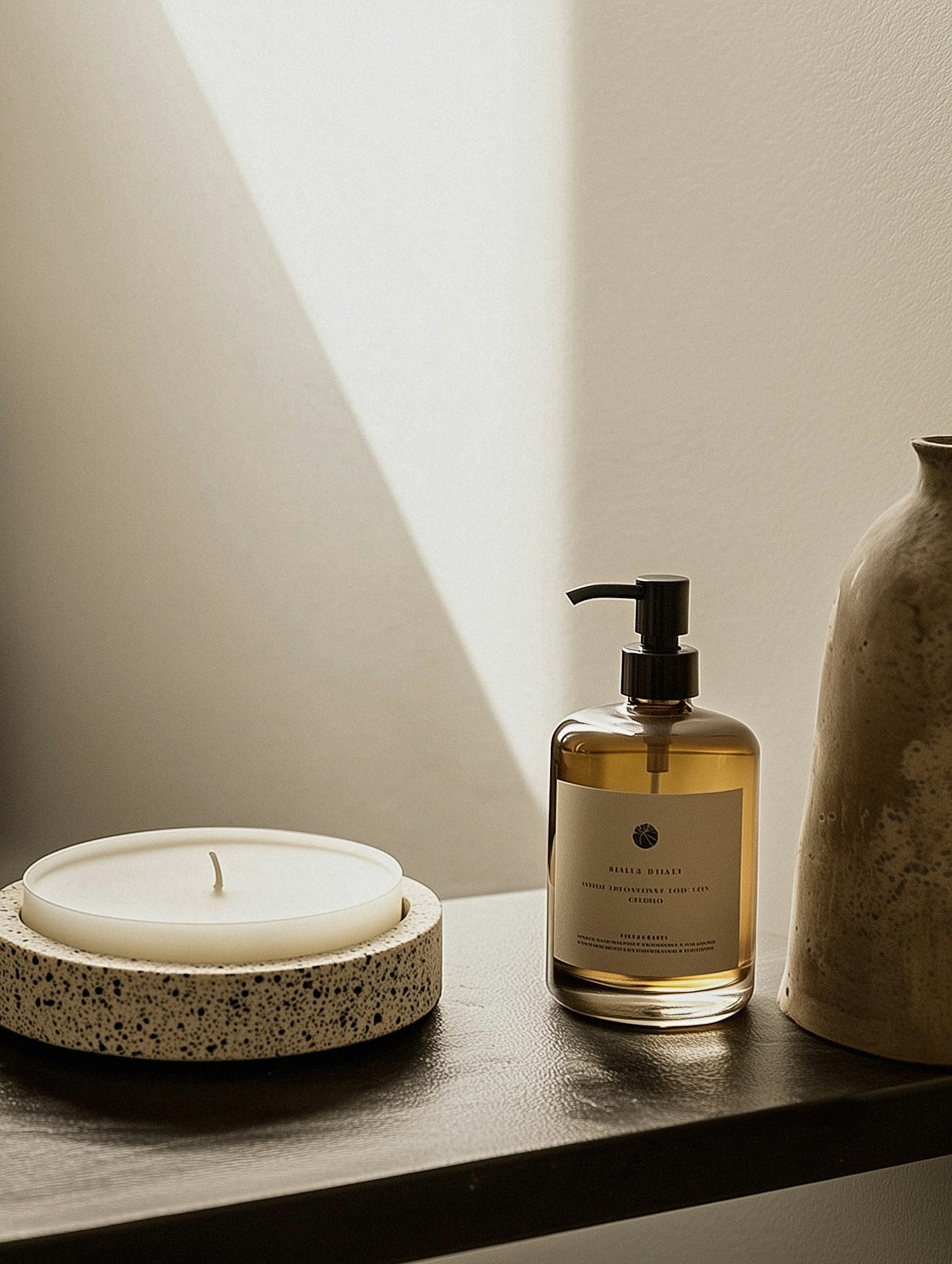 Minimalist shelf with a white candle, amber glass bottle, and ceramic vase in soft natural light.