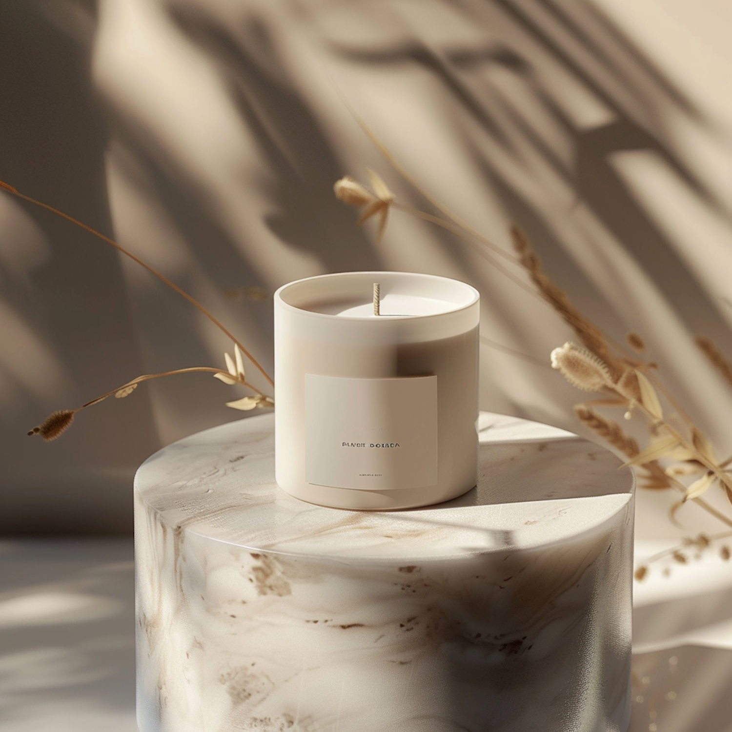 Minimalist white candle on marble with dried botanicals, soft shadows, and neutral tones create a serene, calming atmosphere.