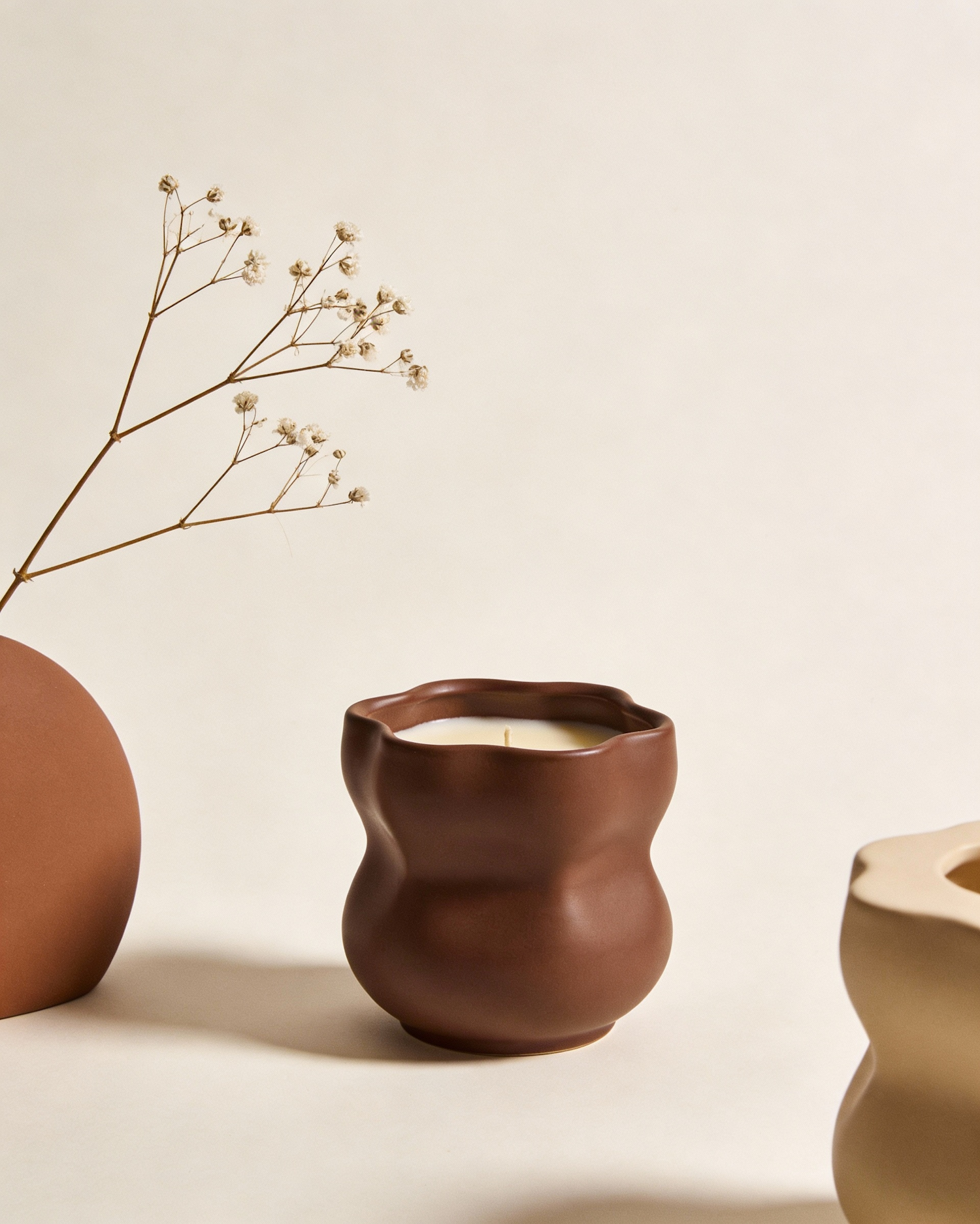 A stylish brown ceramic candle holder with a wavy design, paired with a beige vase and dried flowers, set against a neutral background.