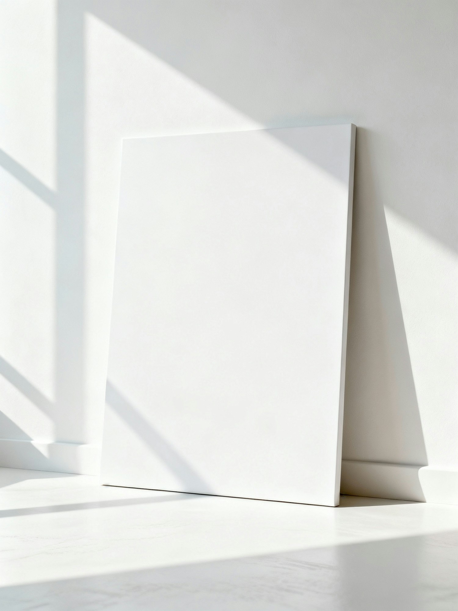A blank white canvas leaning against a wall, illuminated by soft natural light and geometric shadows, creating a minimalist aesthetic.