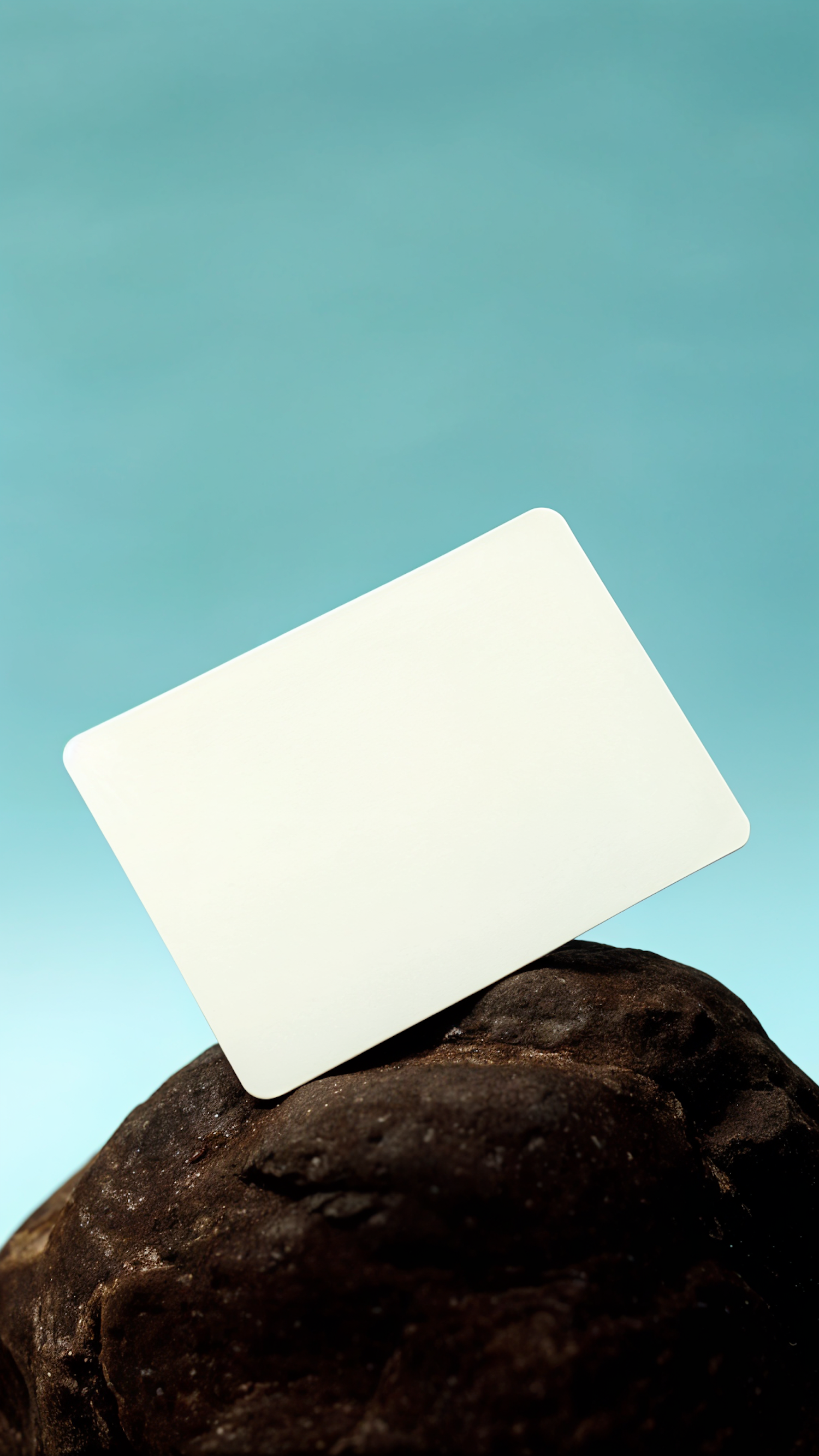Blank white card on a textured rock with a light blue background, creating a minimalist and serene composition.