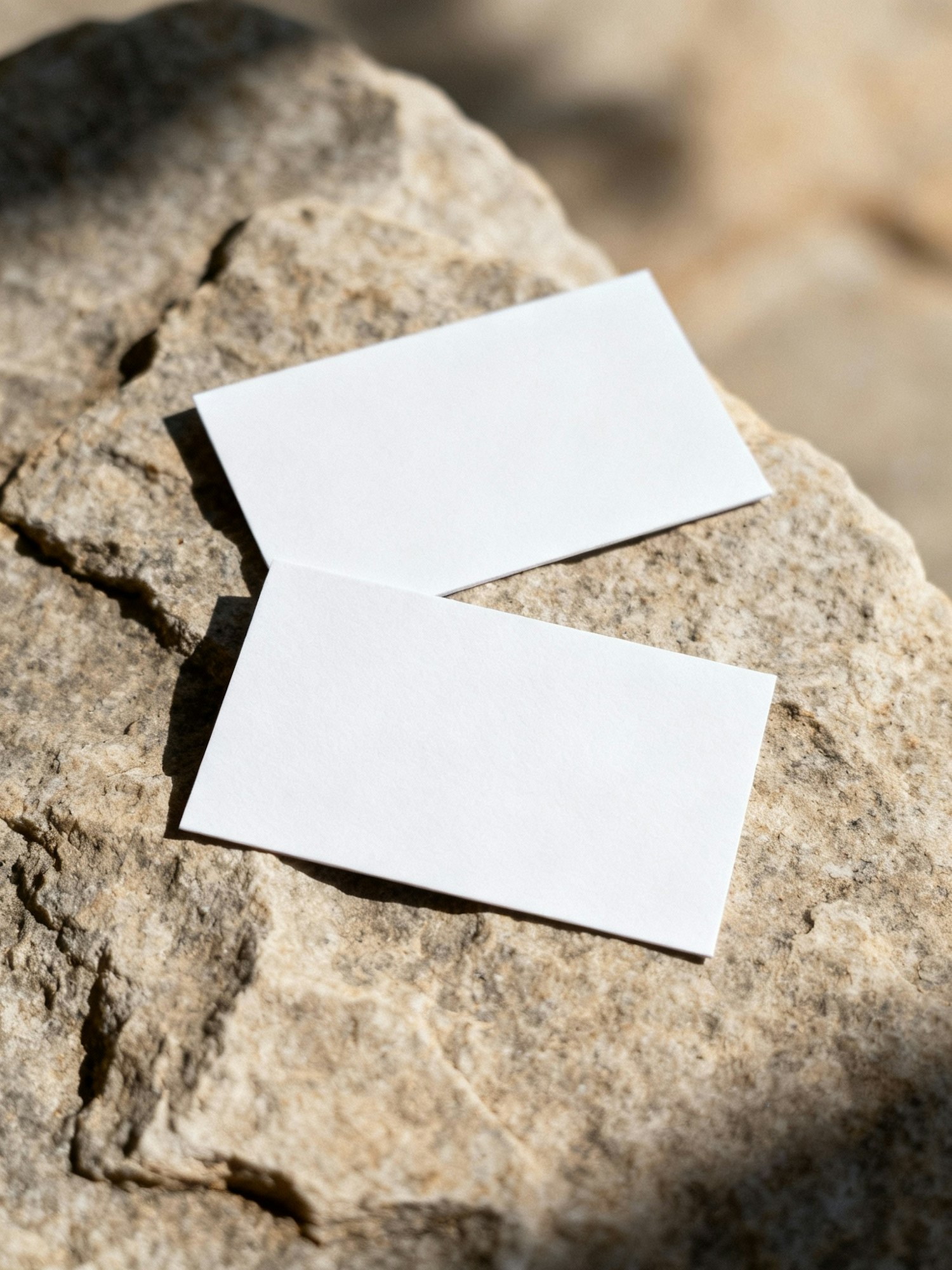 Two blank white cards on a textured stone surface, illuminated by natural sunlight, creating a clean and minimalistic aesthetic.