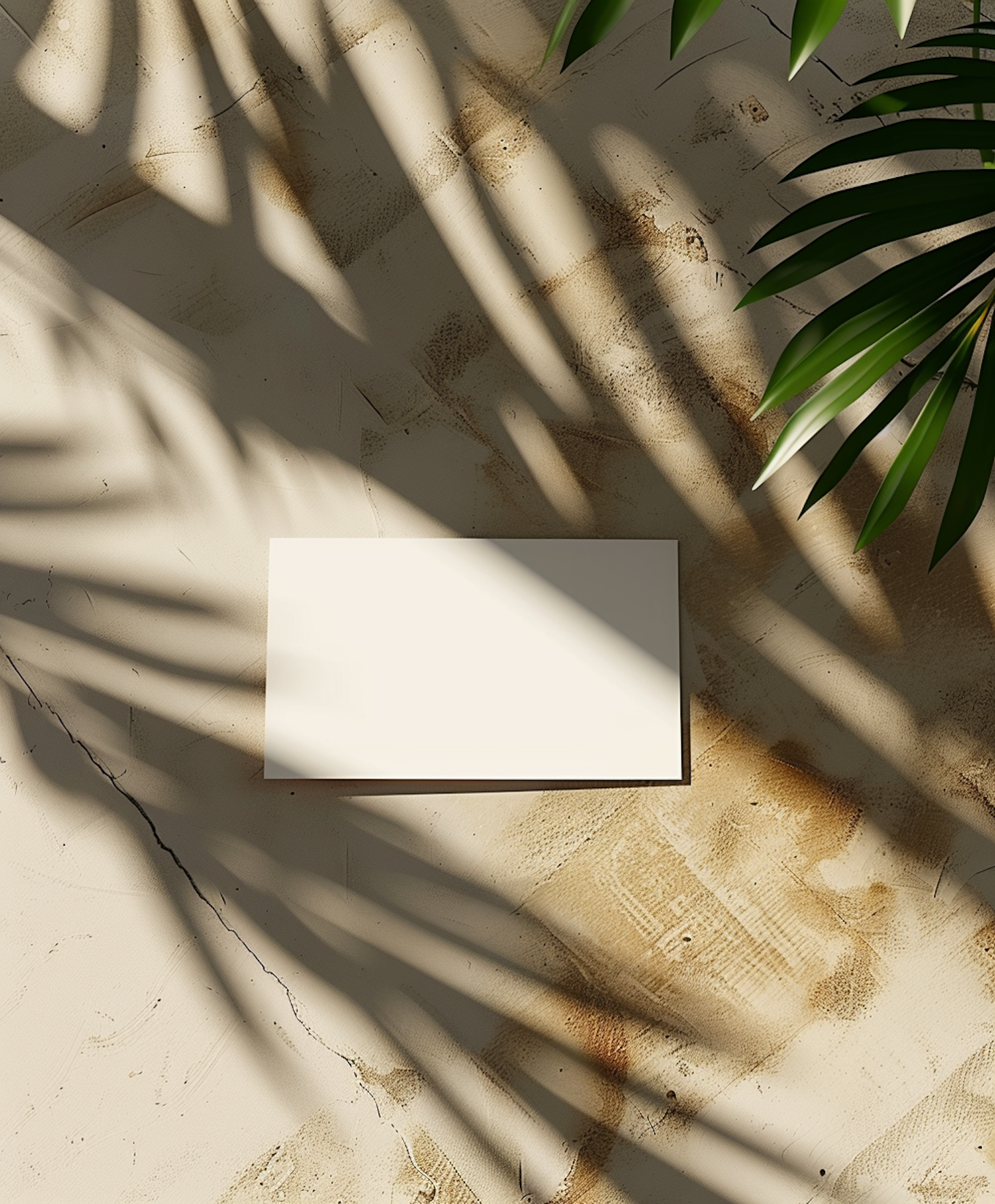A blank white card on a textured beige surface with palm leaf shadows, creating a natural and minimalistic aesthetic.