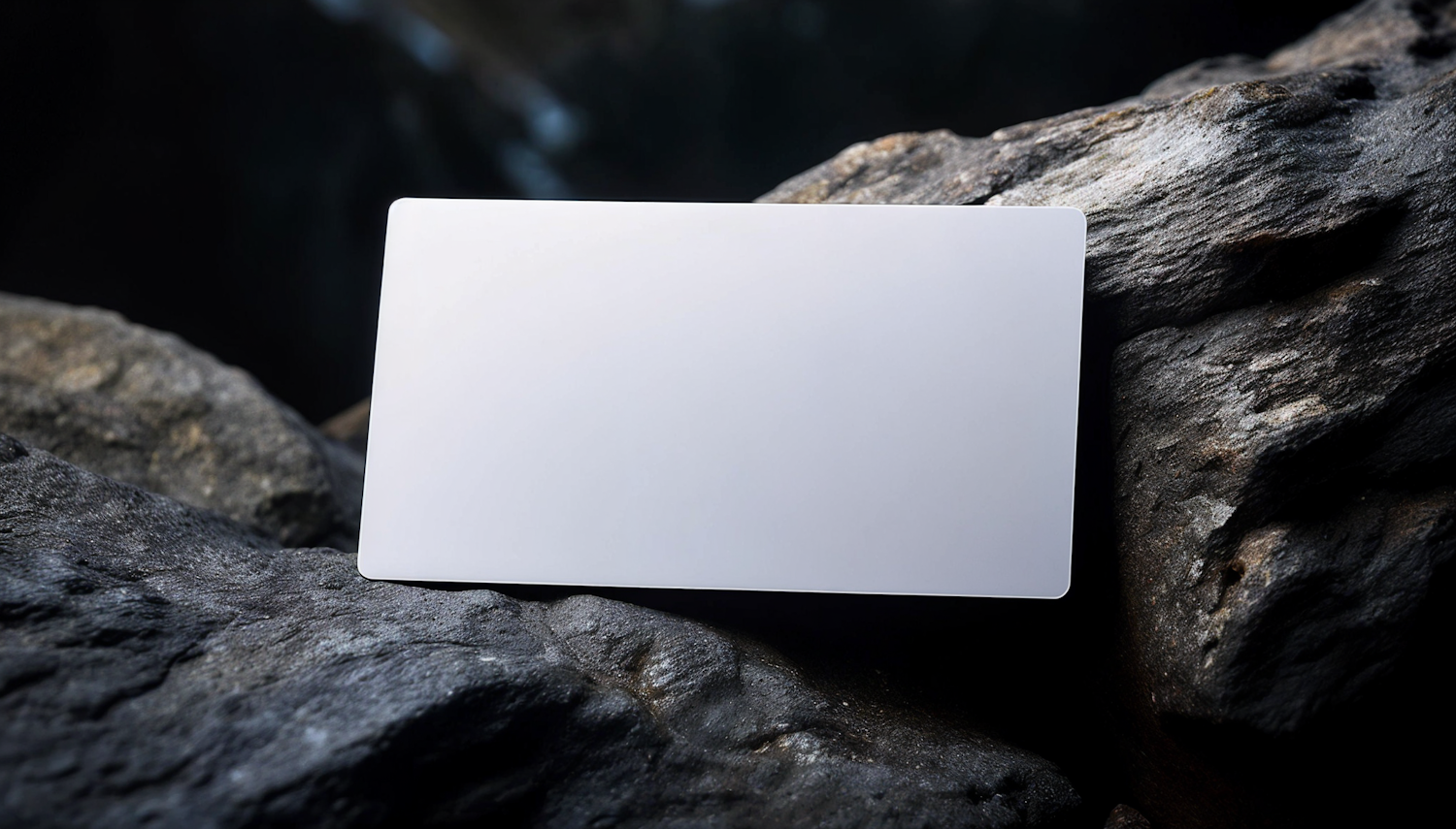A sleek white card with rounded corners on rugged gray rocks, highlighting contrast between modern design and natural textures.