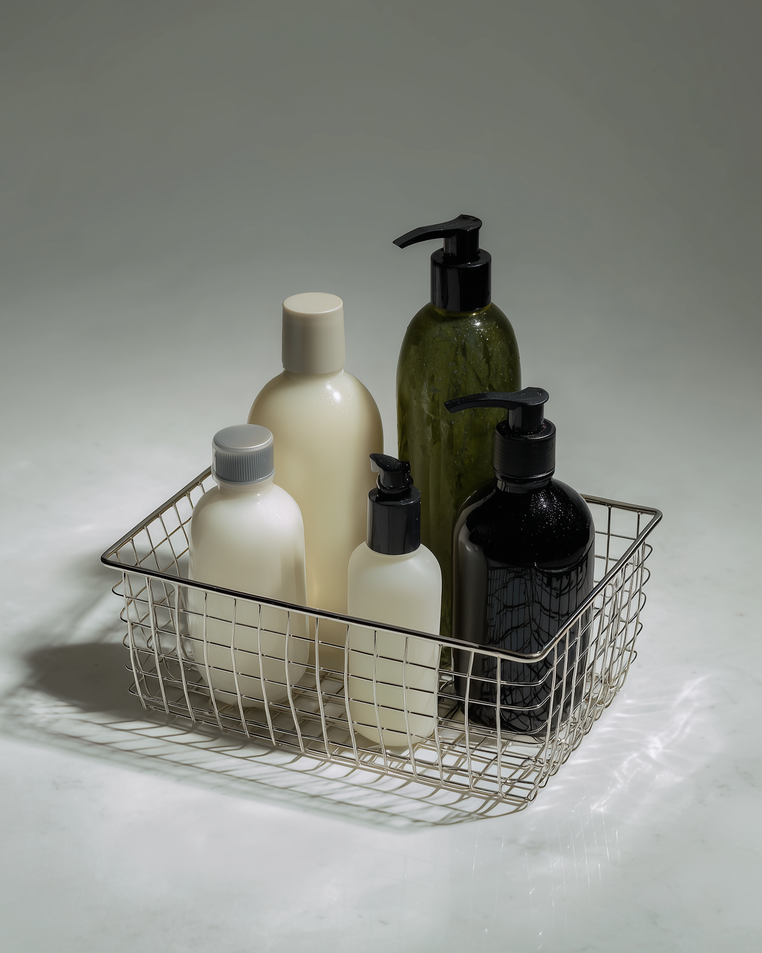 A wire basket with assorted personal care bottles on a sleek surface, showcasing a clean and minimalistic aesthetic.