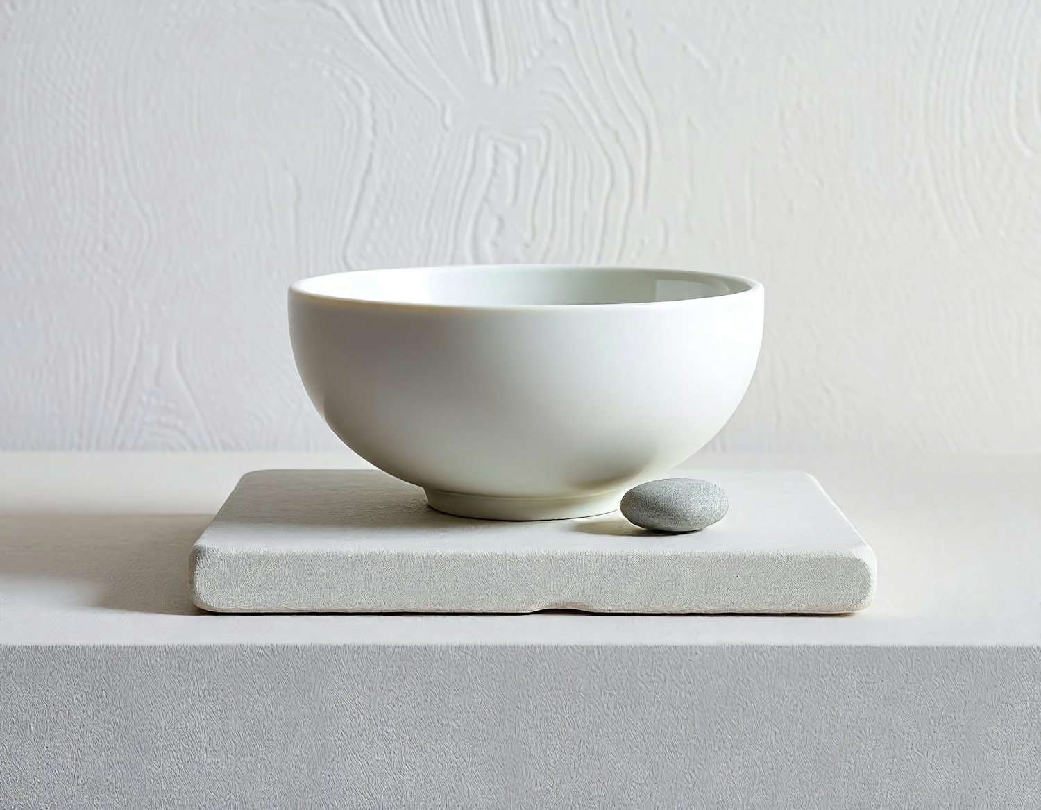 Minimalist white bowl on a textured stone slab with a gray pebble, set against a light textured wall. Neutral tones create a serene scene.