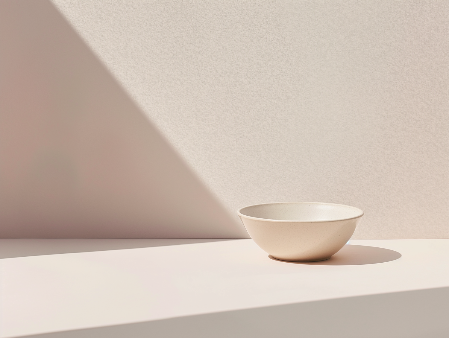 Minimalist cream ceramic bowl on a beige surface with dramatic shadow play, creating a serene and elegant composition.