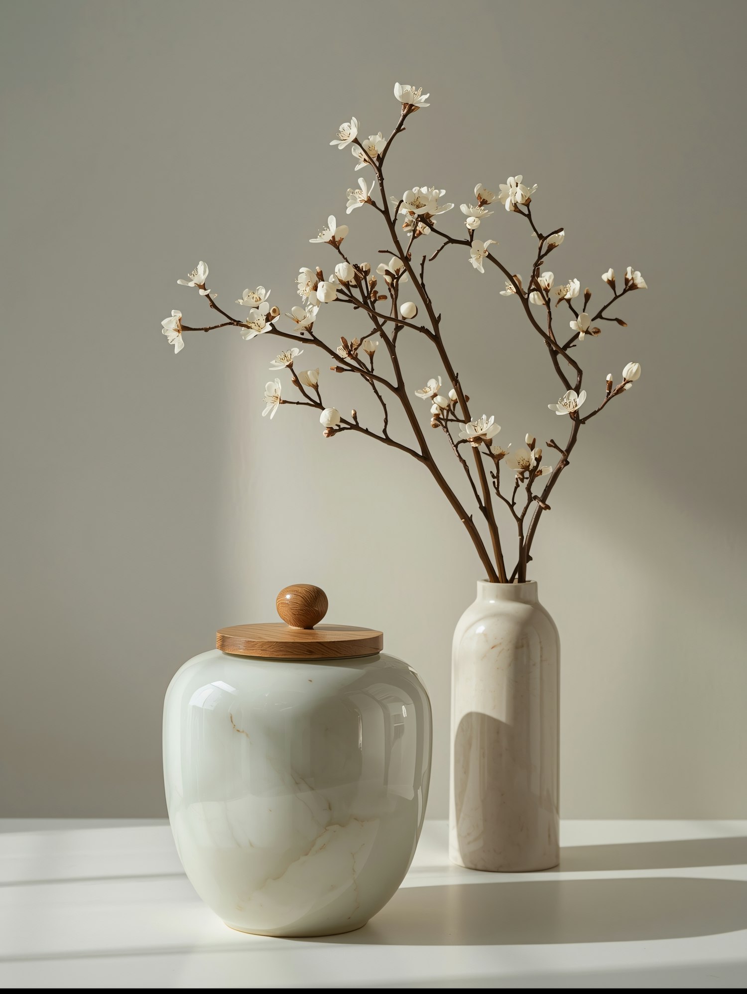 Minimalist decor with a white ceramic jar, wooden lid, and a vase holding delicate white blossoms, set against a neutral background.