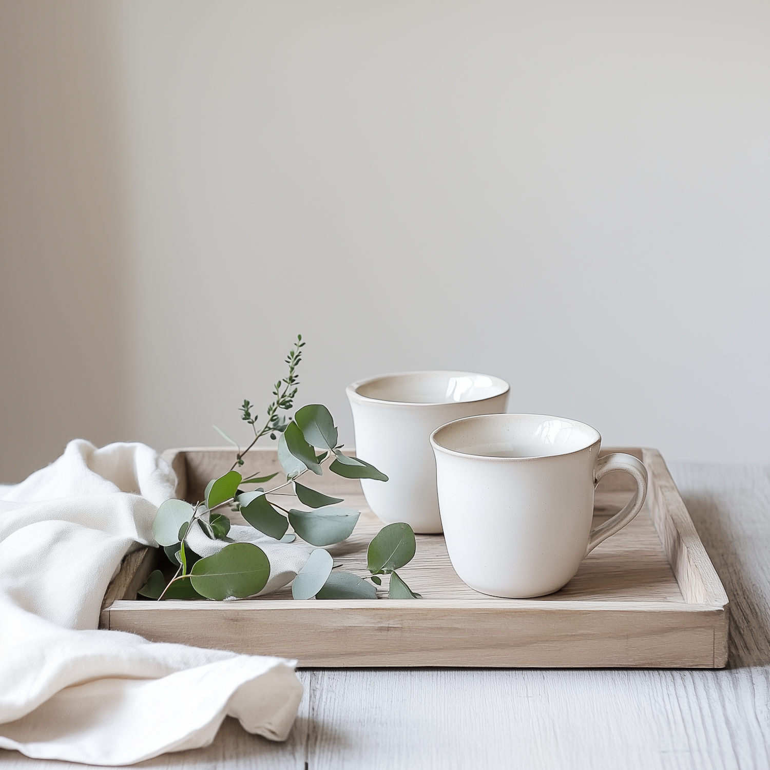 Minimalist scene with two white mugs on a wooden tray, accented by eucalyptus leaves and a white cloth, set against a neutral background.