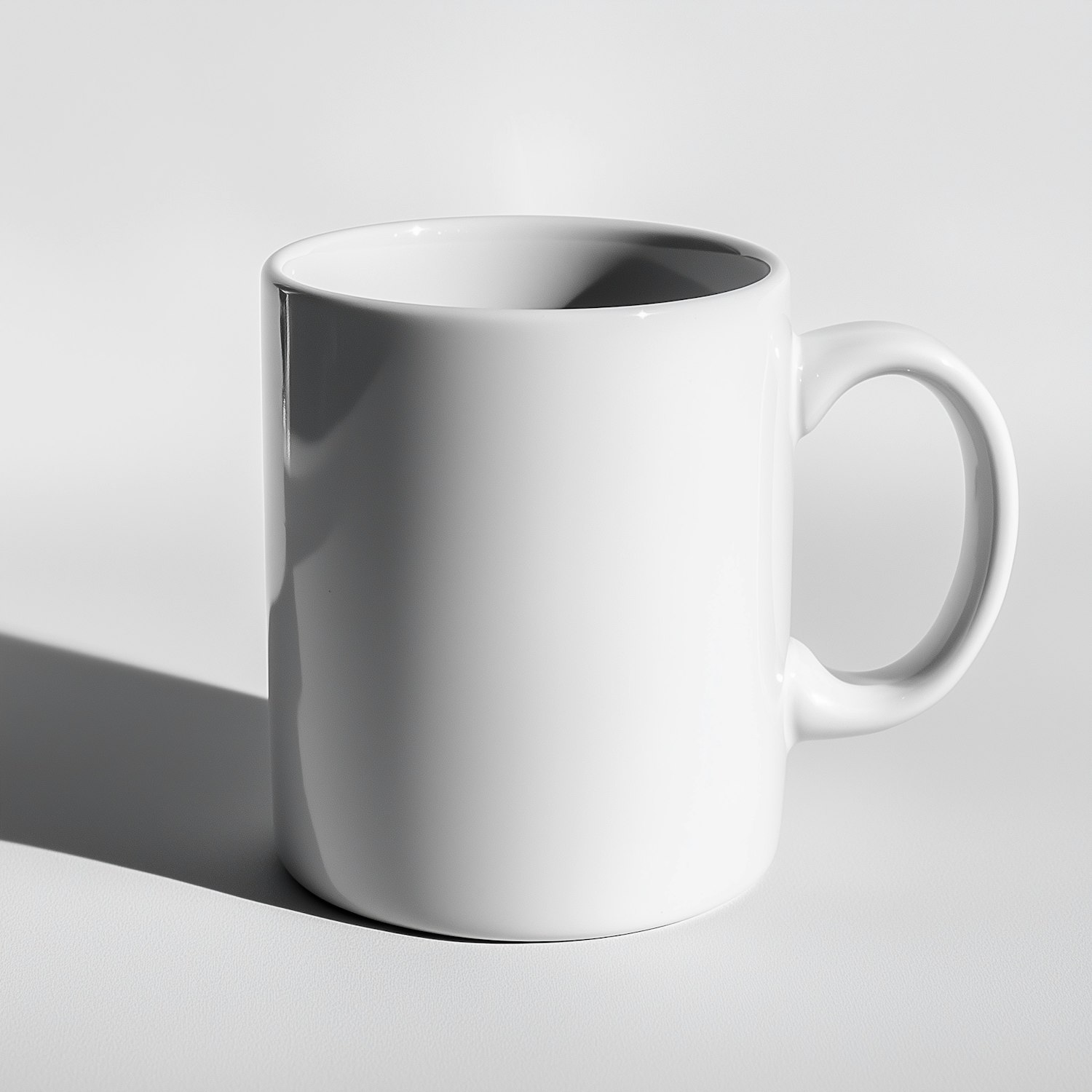 Minimalist white ceramic mug with a glossy finish, set against a light gray background. Perfect for coffee or tea lovers.