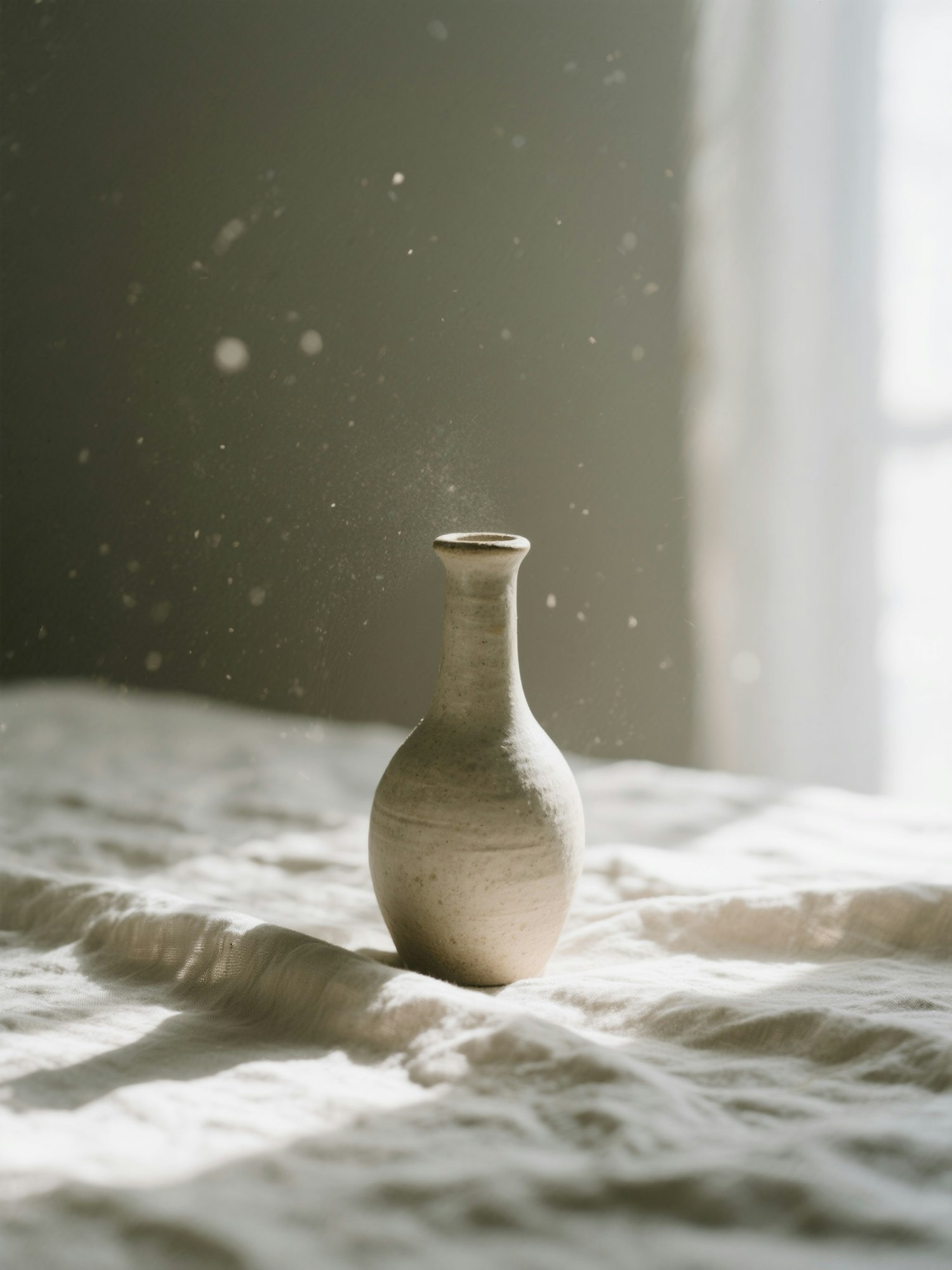 A minimalist ceramic vase on a textured white fabric, bathed in soft natural light with floating dust particles creating a serene ambiance.