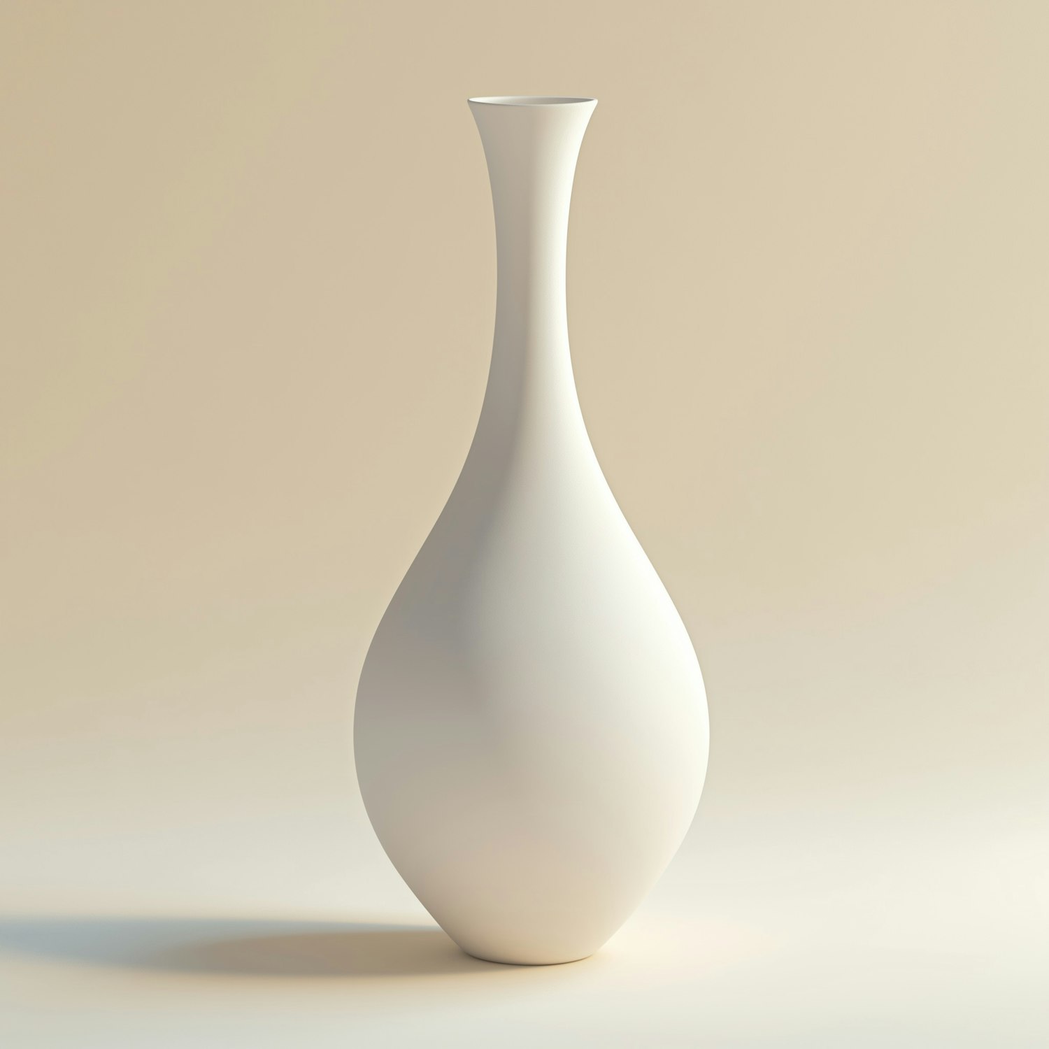 A sleek white ceramic vase with a rounded base and elongated neck, set against a neutral beige background for a minimalist aesthetic.