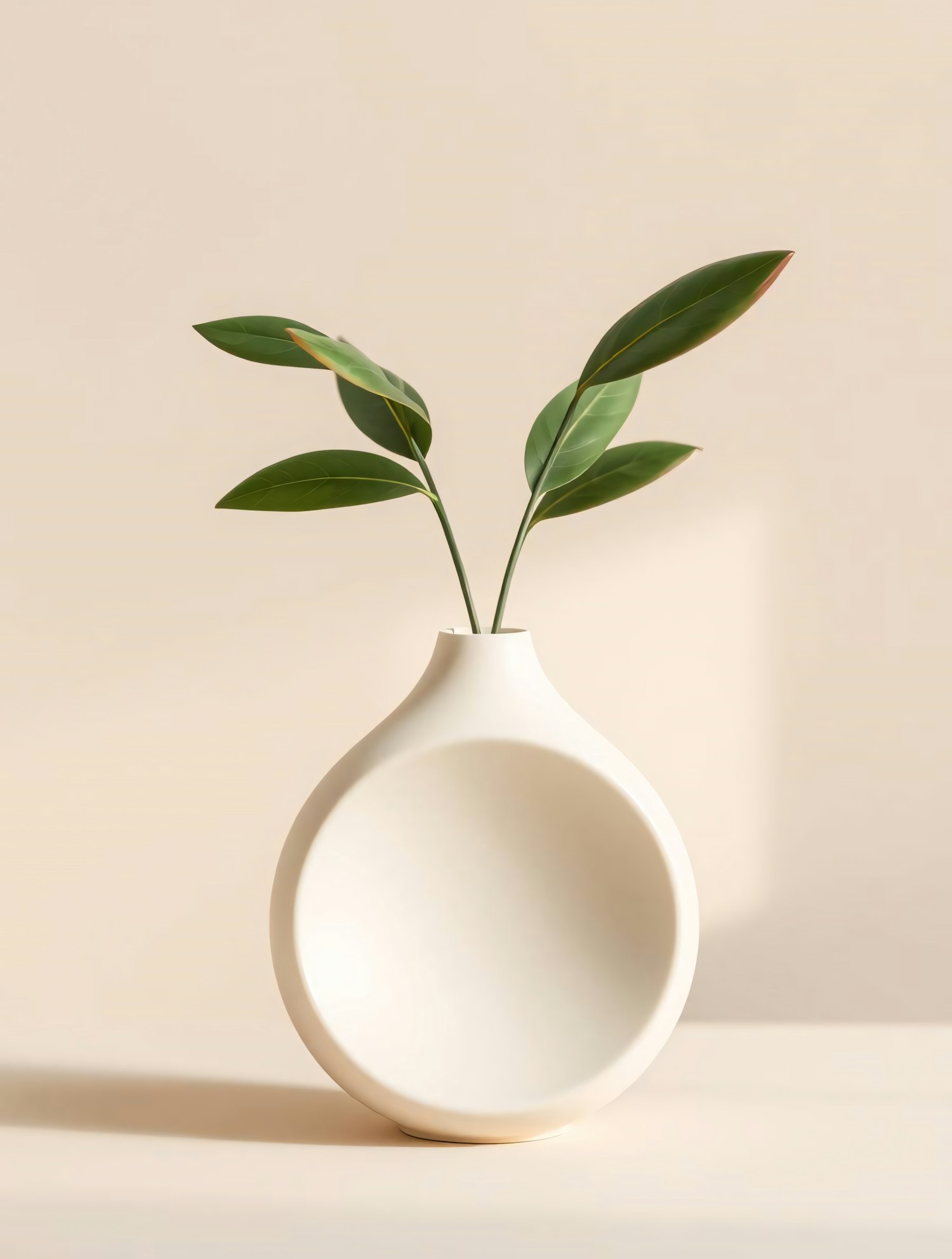 Minimalist off-white ceramic vase with green leaves on a beige background, perfect for modern decor inspiration.