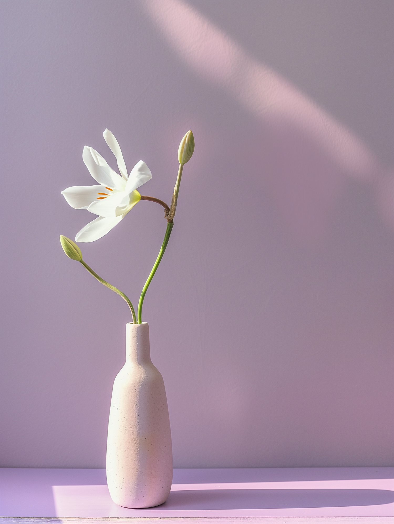 Elegant white lily in a minimalist vase against a soft lavender background, bathed in gentle sunlight.