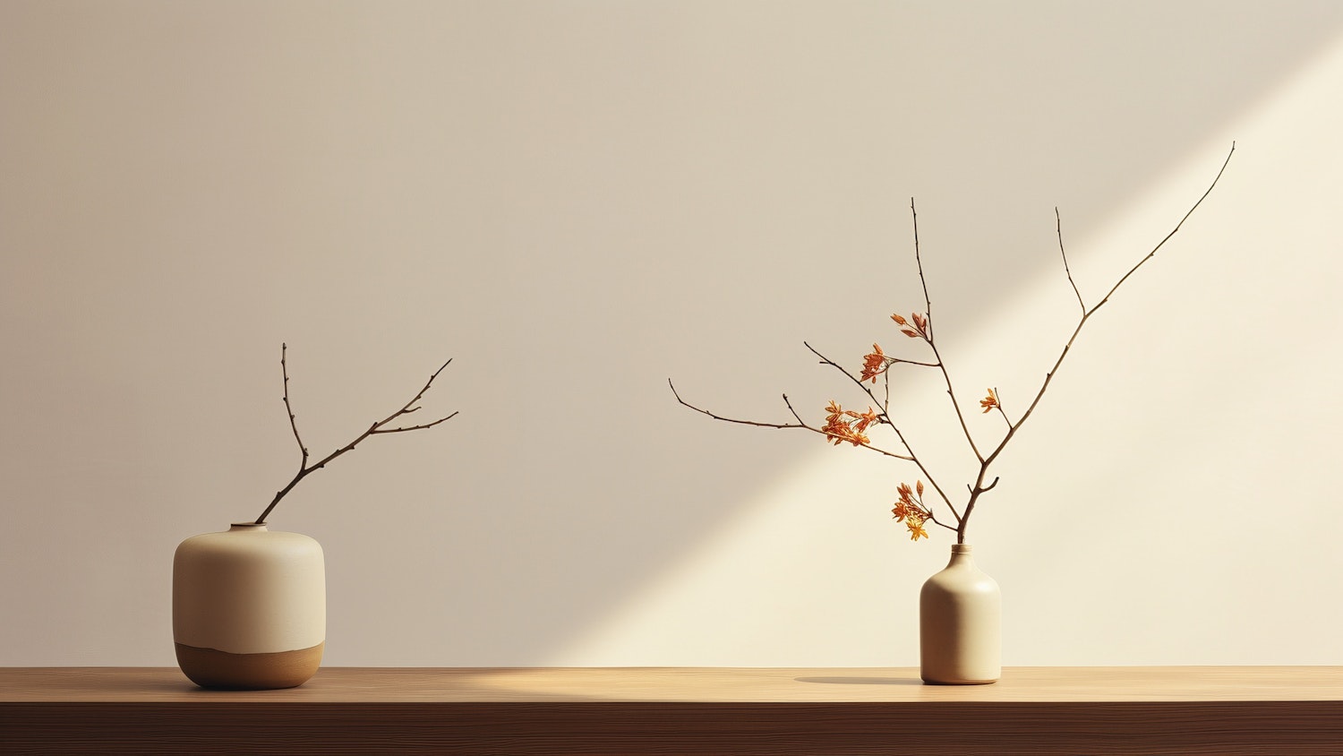 Minimalist vases with branches and flowers on a wooden surface, set against a light background with soft natural lighting.