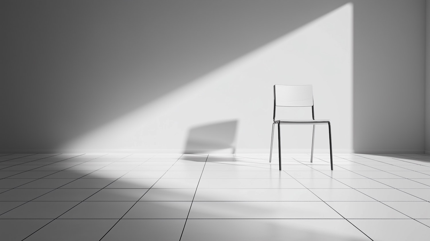 Minimalist scene with a modern chair on a white tiled floor, dramatic light and shadow creating a clean, artistic vibe.