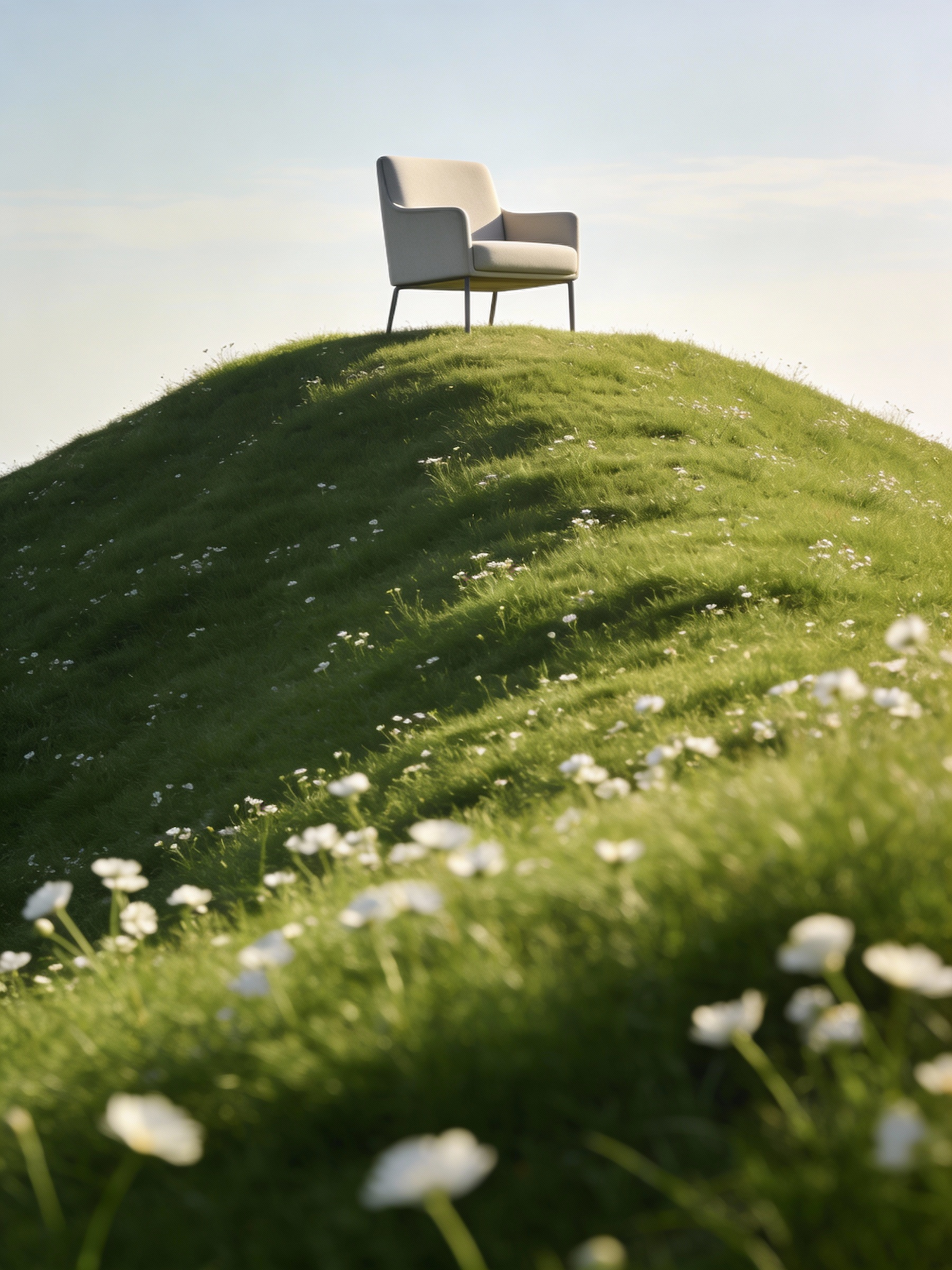 A minimalist armchair standing alone on top of a gentle green hill, viewed from a distance but slightly closer, making the chair more prominent while keeping strong negative space and scale. Soft realistic grass and tiny white flowers across the hill, clear sky, subtle atmospheric depth. Serene balanced composition. Natural warm light. Ultra detailed, cinematic lighting, 8k, realistic textures, minimal design aesthetic.