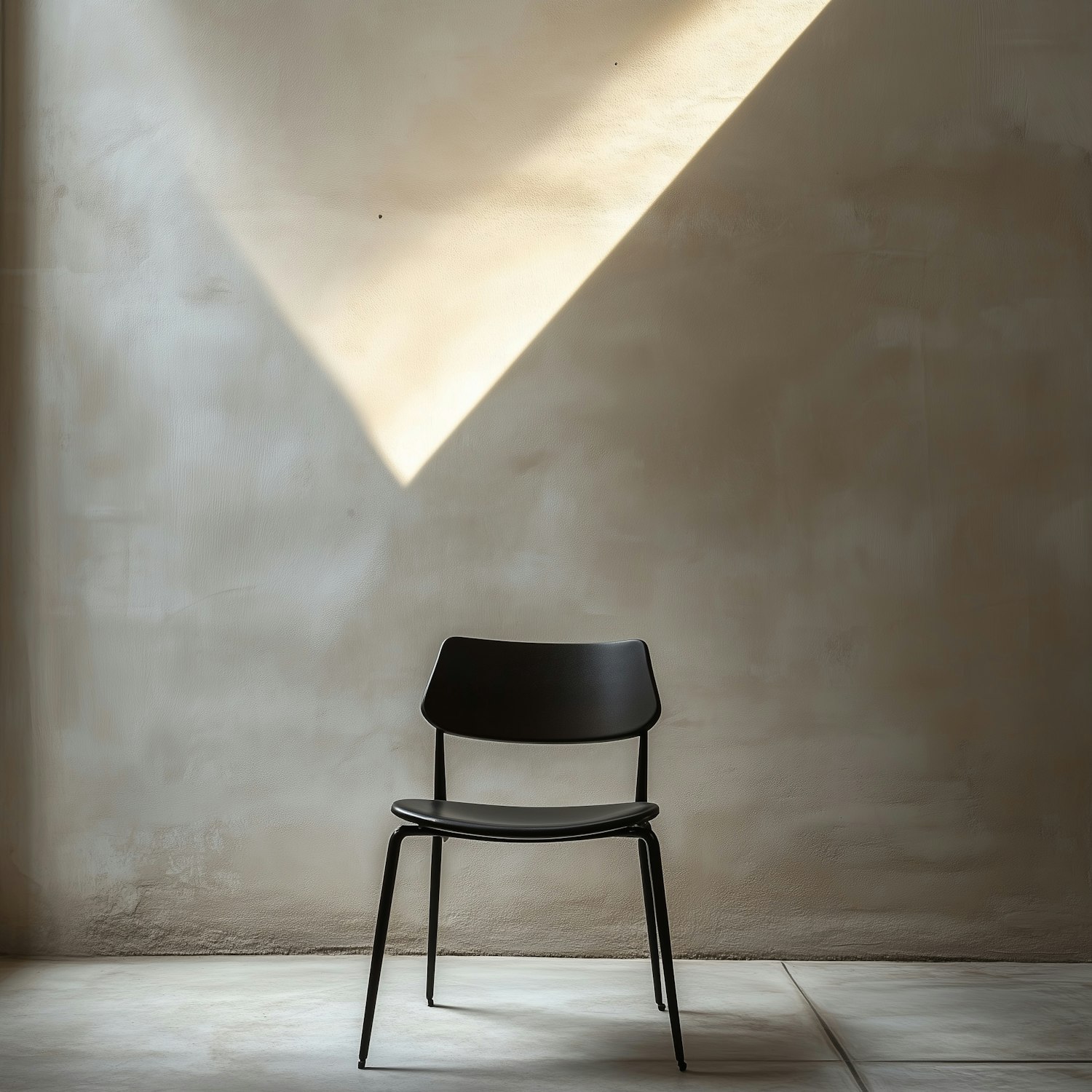 Minimalist black chair in a serene setting with textured beige walls and a striking triangular sunlight beam.
