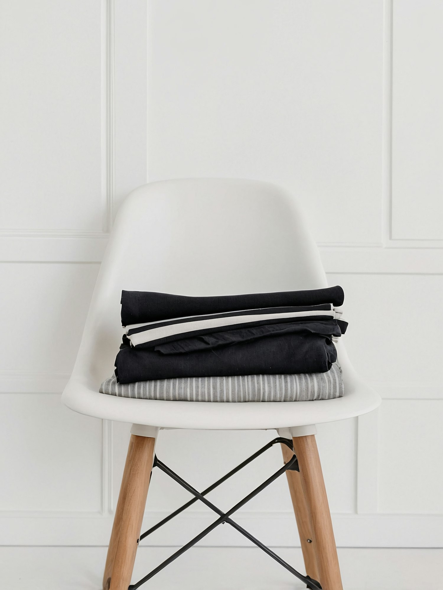 Minimalist white chair with folded black and gray fabrics, showcasing modern design and simplicity.