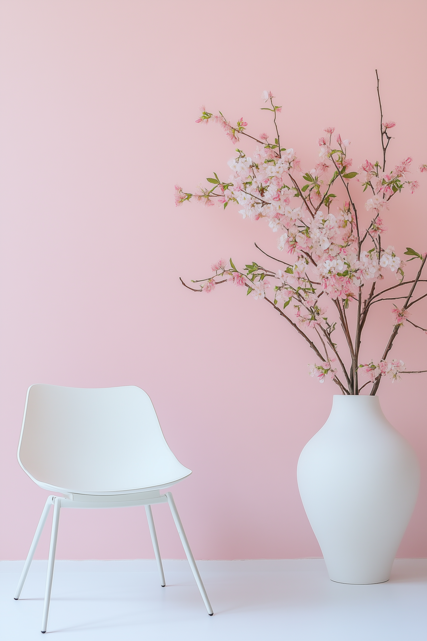 Minimalist decor with a white chair, cherry blossoms in a vase, and a soft pink background for a serene and elegant aesthetic.