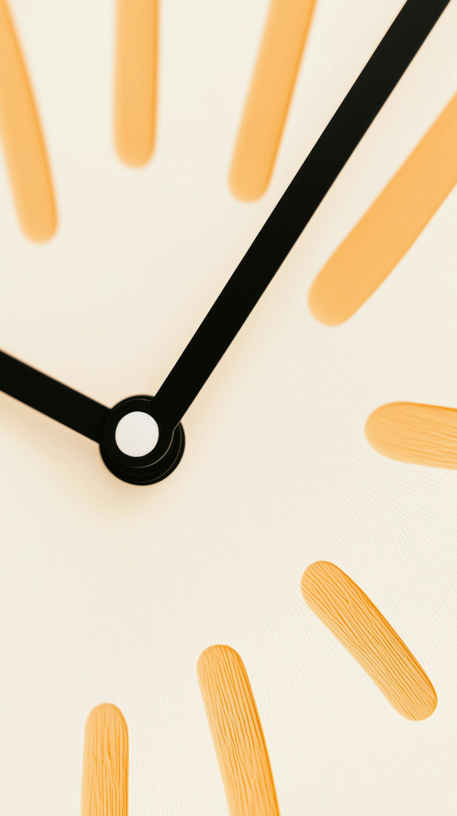 Minimalist clock face close-up with black hands and textured orange hour markers on a cream background. Modern and elegant design.
