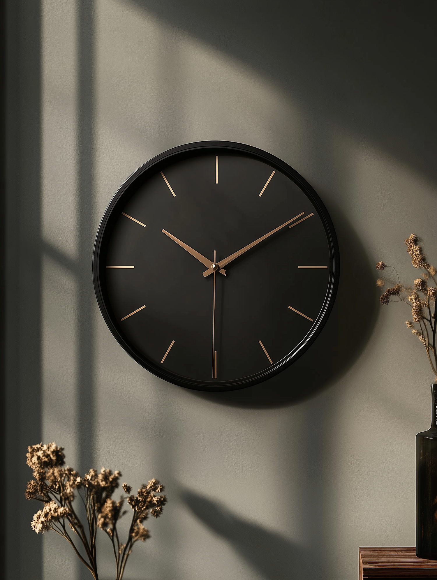 Minimalist black wall clock with gold accents on a green wall, paired with dried flowers in a vase and soft natural light casting shadows.
