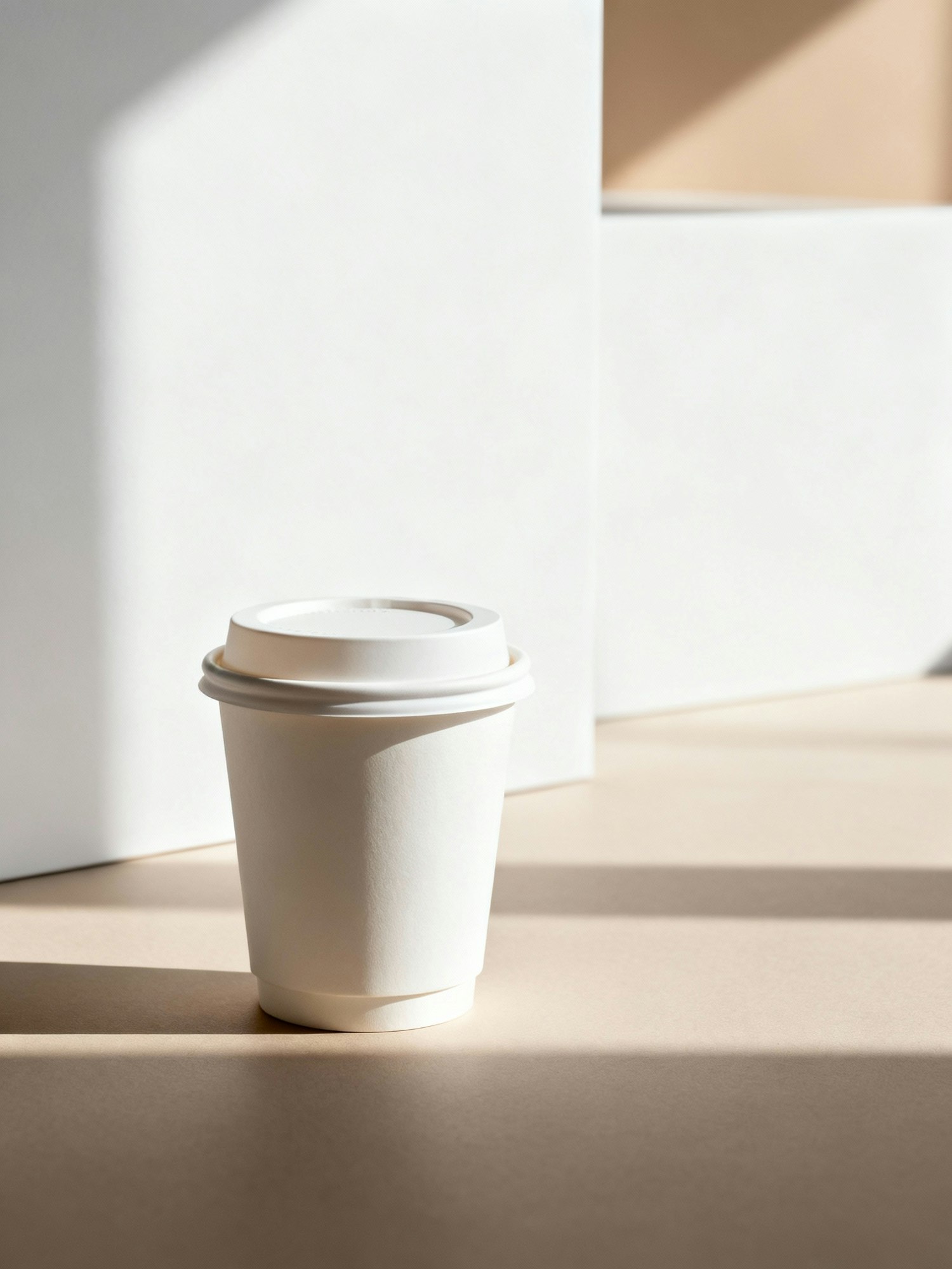Minimalist photo of a white disposable coffee cup on a beige surface with soft lighting and geometric background shapes.