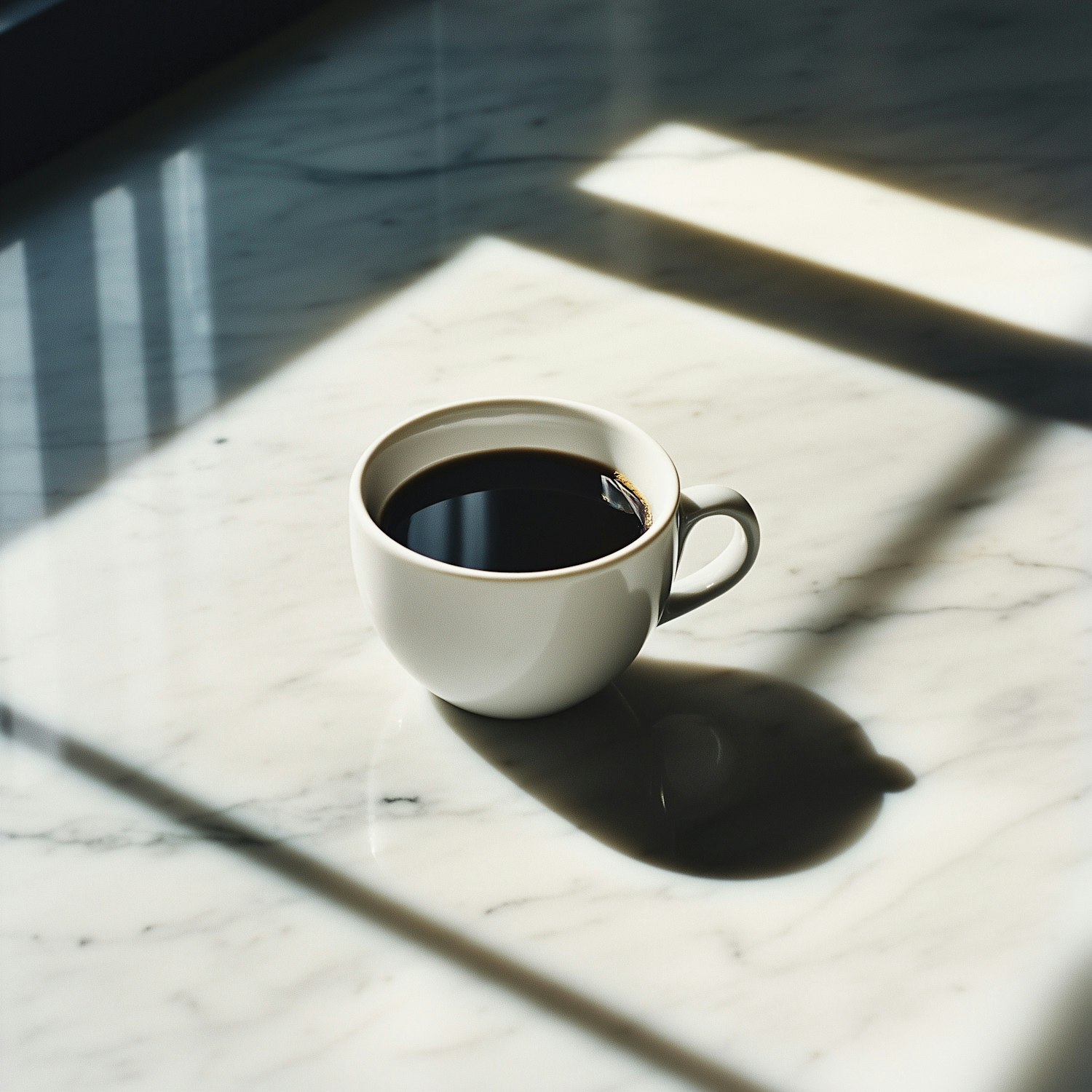 A white cup of black coffee on a marble table, bathed in soft sunlight with dramatic shadows. Perfect minimalist coffee moment.