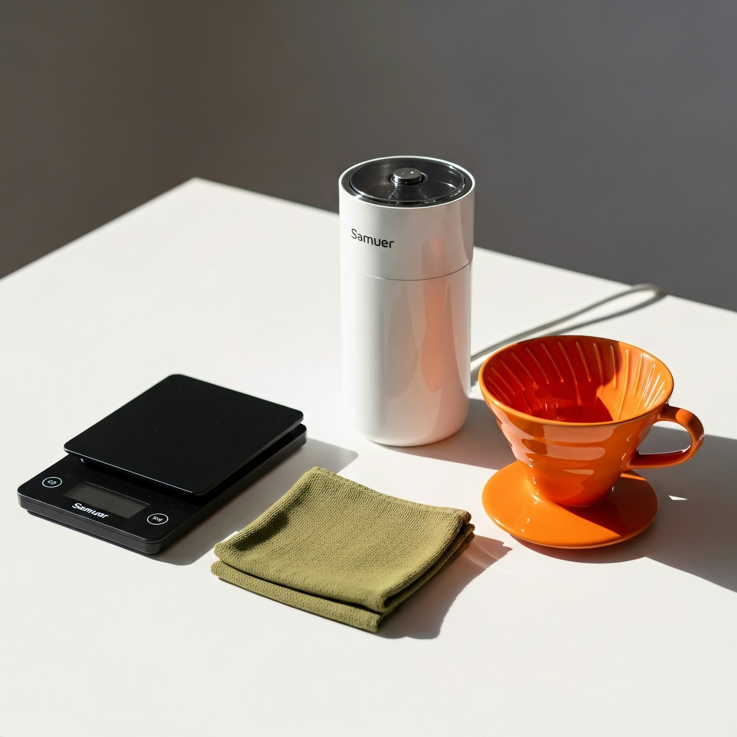 Minimalist coffee brewing setup with a grinder, scale, cloth, and orange dripper on a white surface, perfect for pour-over enthusiasts.