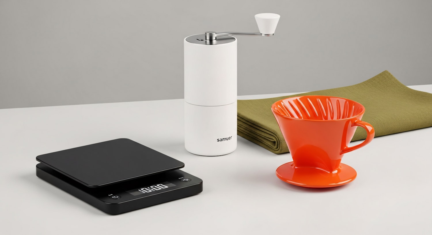 Minimalist coffee setup with a black scale, white grinder, orange dripper, and green cloth on a clean surface.