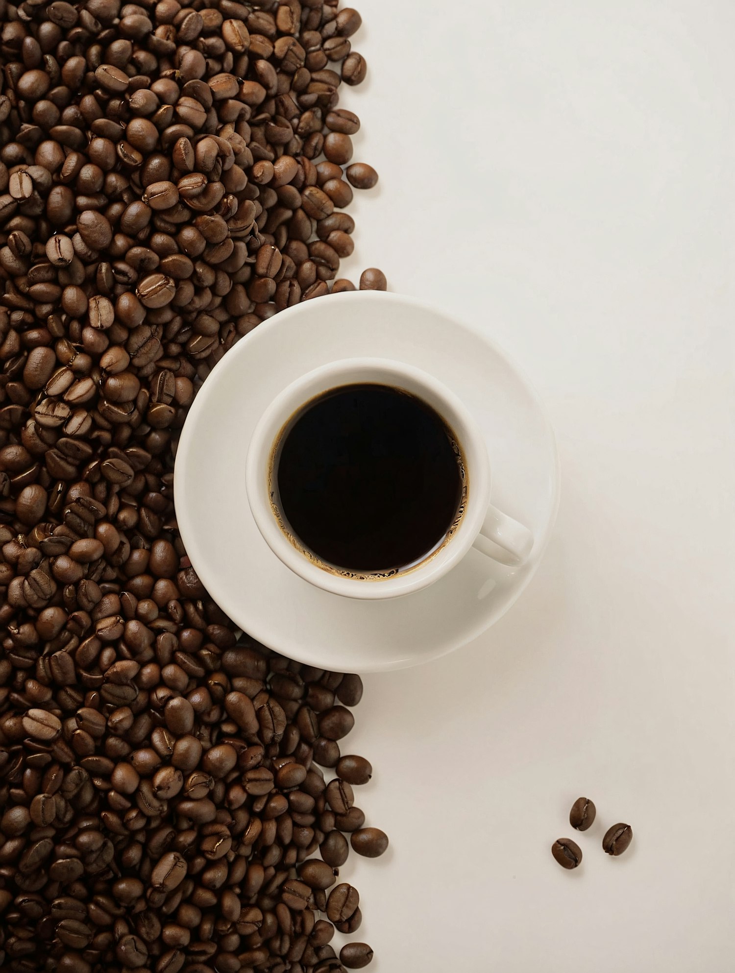 A white cup of black coffee surrounded by roasted coffee beans on a clean white background. Perfect for coffee lovers!