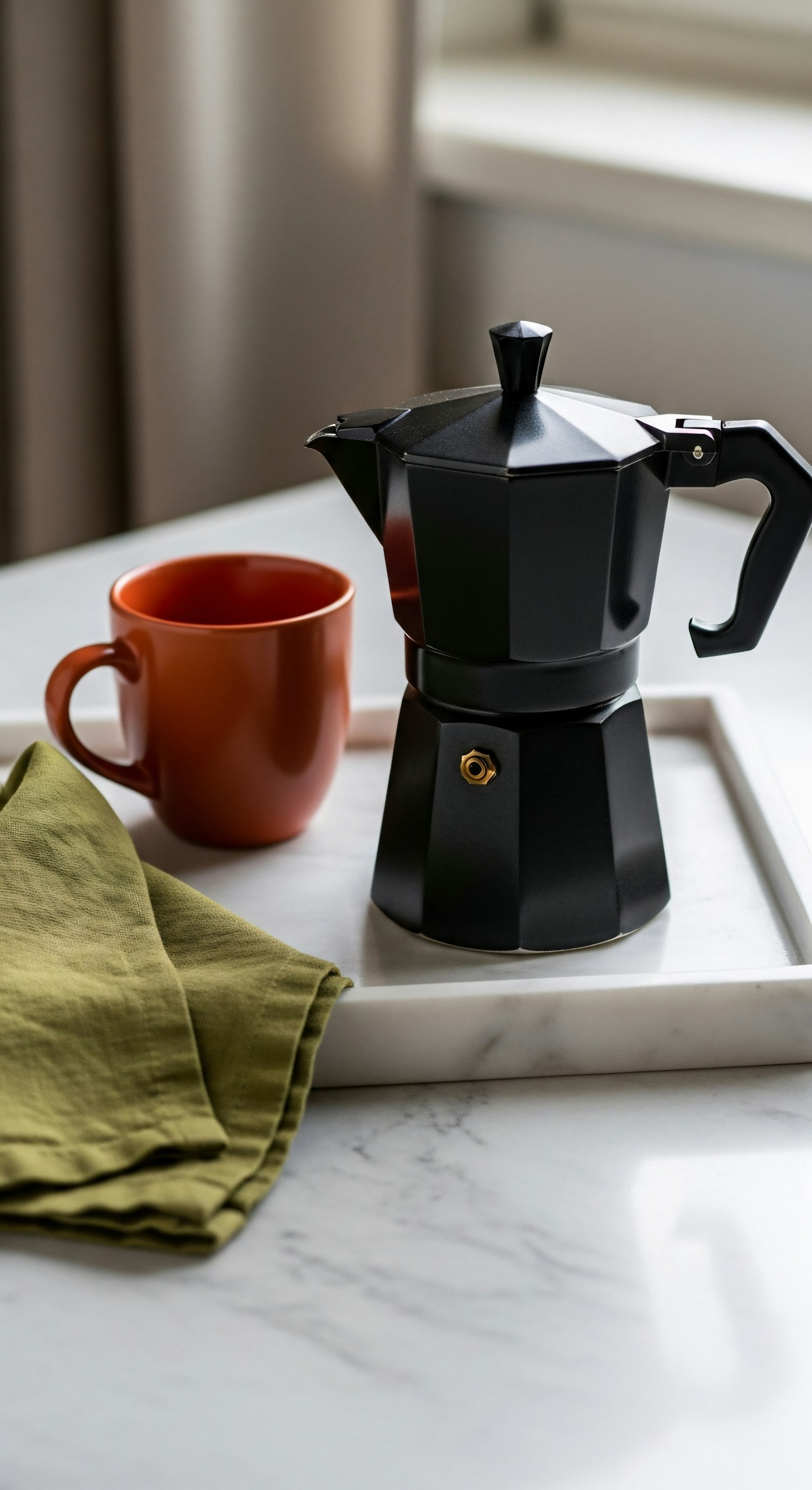A black stovetop espresso maker on a marble tray with a red mug and green napkin, creating a cozy and minimalist coffee setup.
