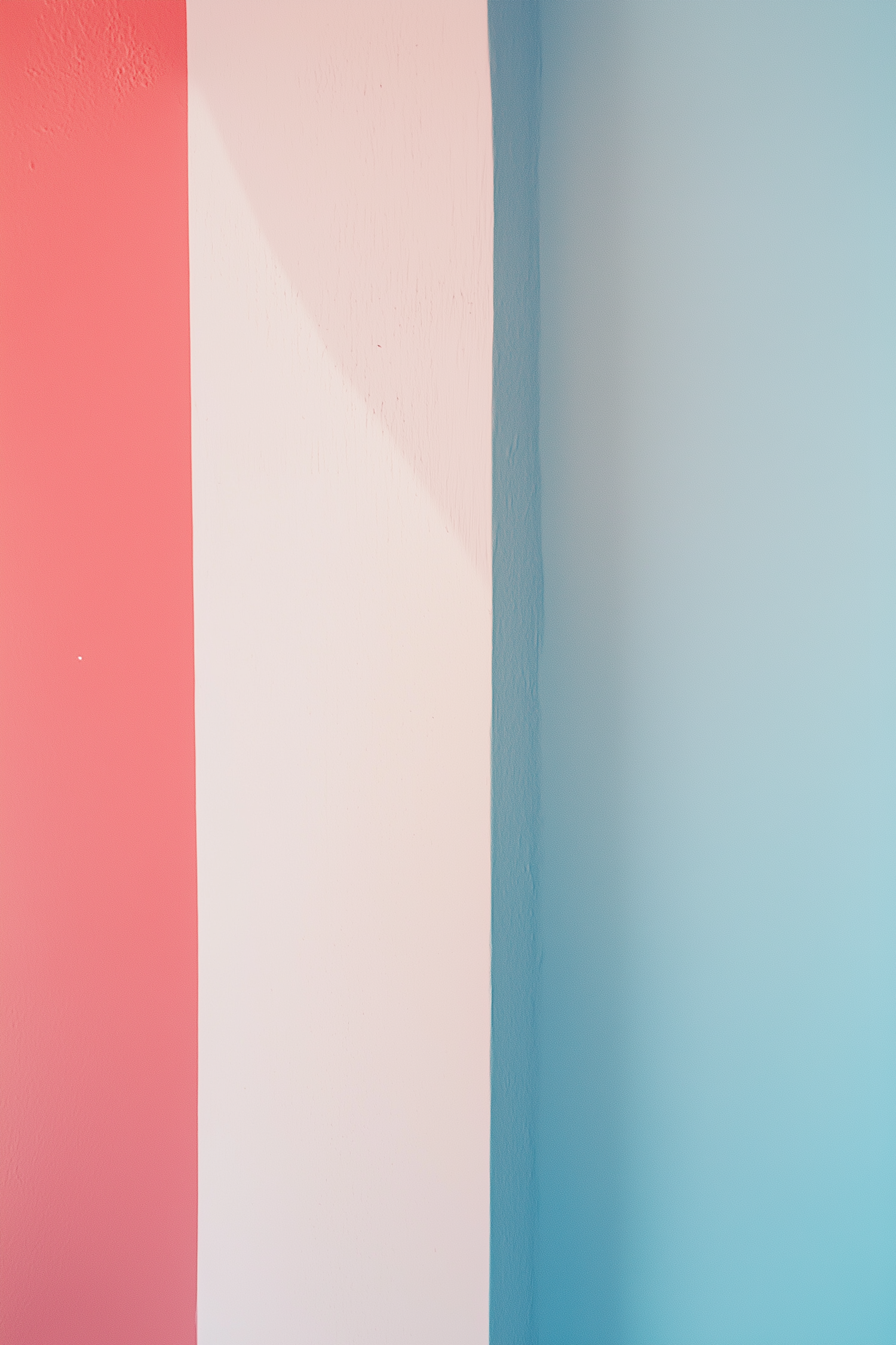 Minimalist wall design with pastel pink, white, and blue vertical color blocks, creating a clean and modern aesthetic.