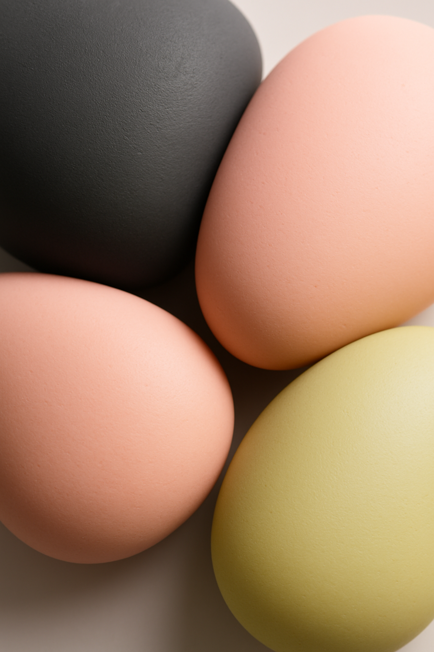 A close-up of a creative display featuring colored eggs in shades of black, pink, and green, arranged on a neutral background.