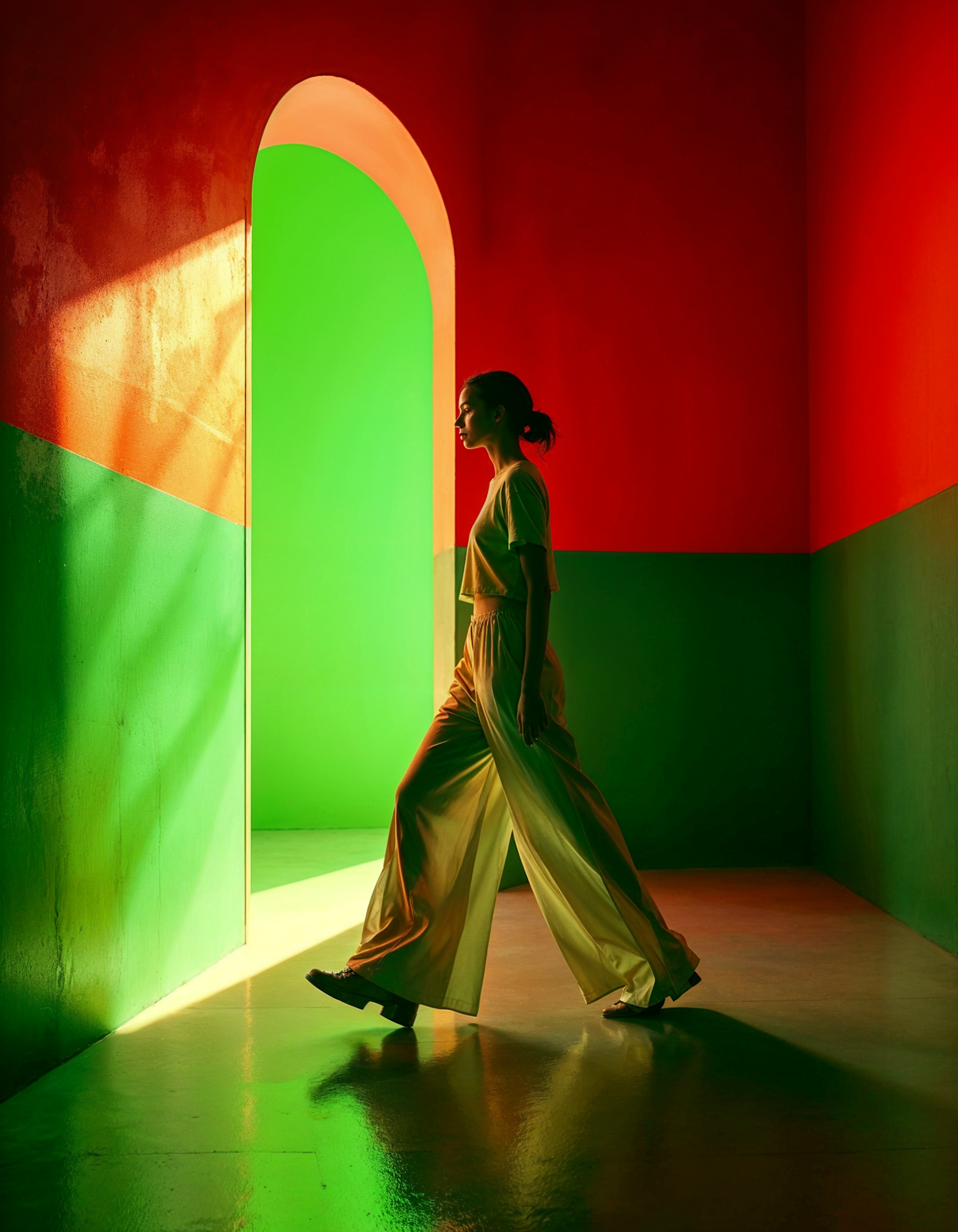 A woman in a flowing yellow outfit walks through a bold red and green minimalist space with dramatic lighting and a glowing green archway.