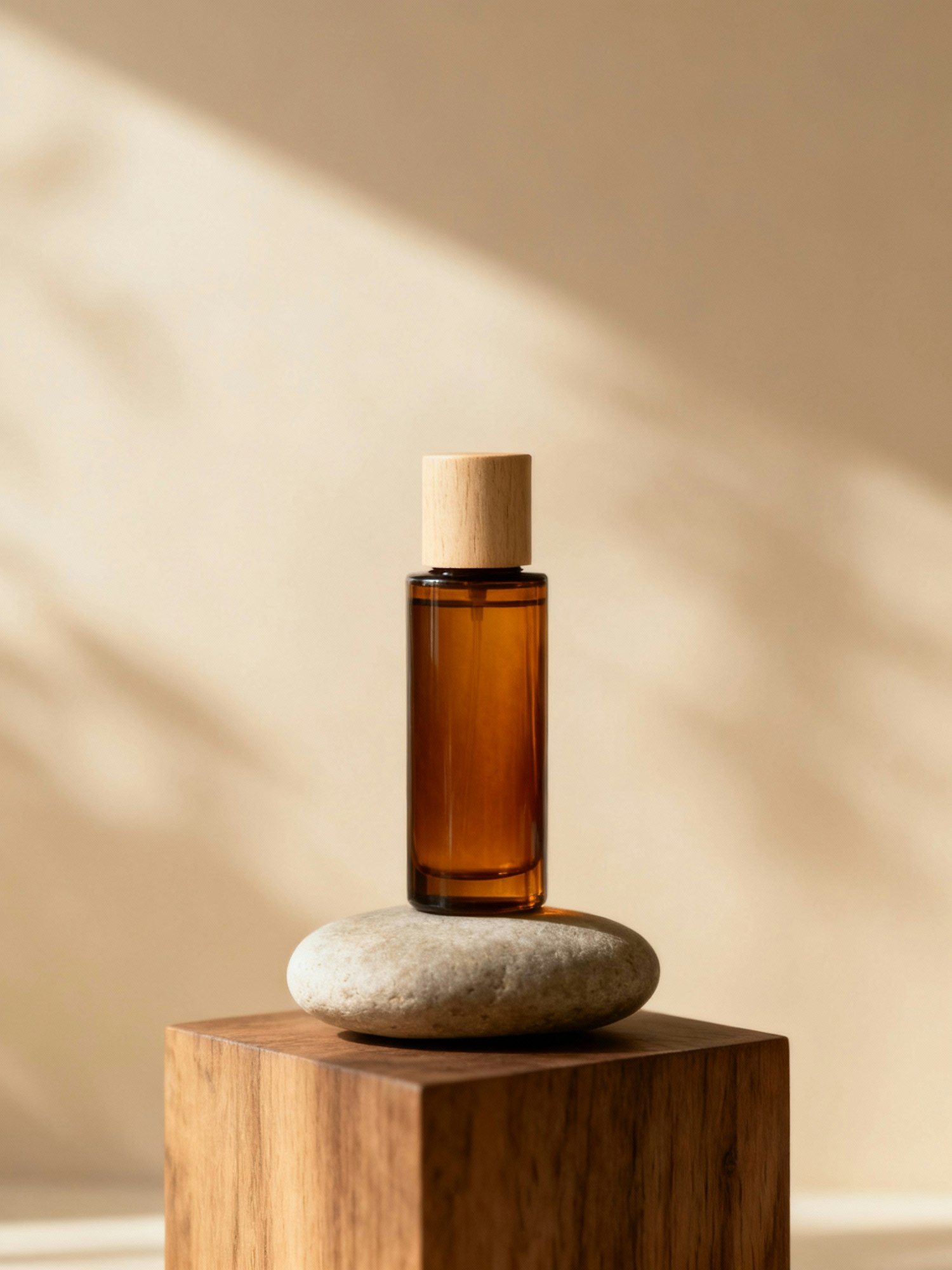 Single amber-brown translucent skincare bottle with a light wooden cap, no label or text, placed on a minimalist studio set. The product stands on a smooth stone or wooden pedestal, against a soft beige background. Warm diffused light from one side creates elegant shadows and subtle gradients of tone. The atmosphere feels calm, refined, and sensory — textures of stone, wood, and light gently interacting. Earthy and warm color palette: beige, sand, and muted brown. Ultra realistic lighting, cinematic softness, inspired by high-end skincare campaigns and minimalist architecture photography.
