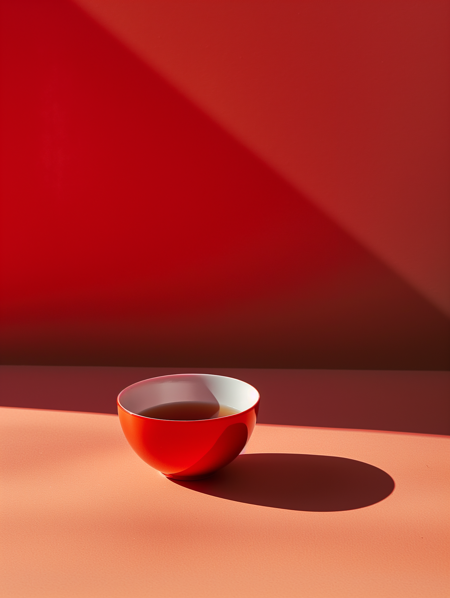 Vibrant red bowl on a peach surface with dramatic lighting and shadows, creating a striking and minimalist composition.