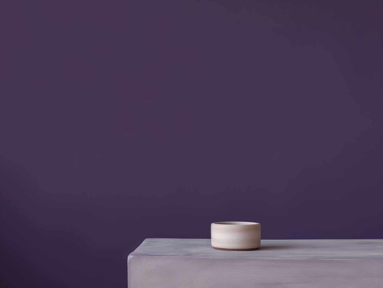 Minimalist ceramic cup on a light gray surface against a deep purple background, highlighting simplicity and elegance.