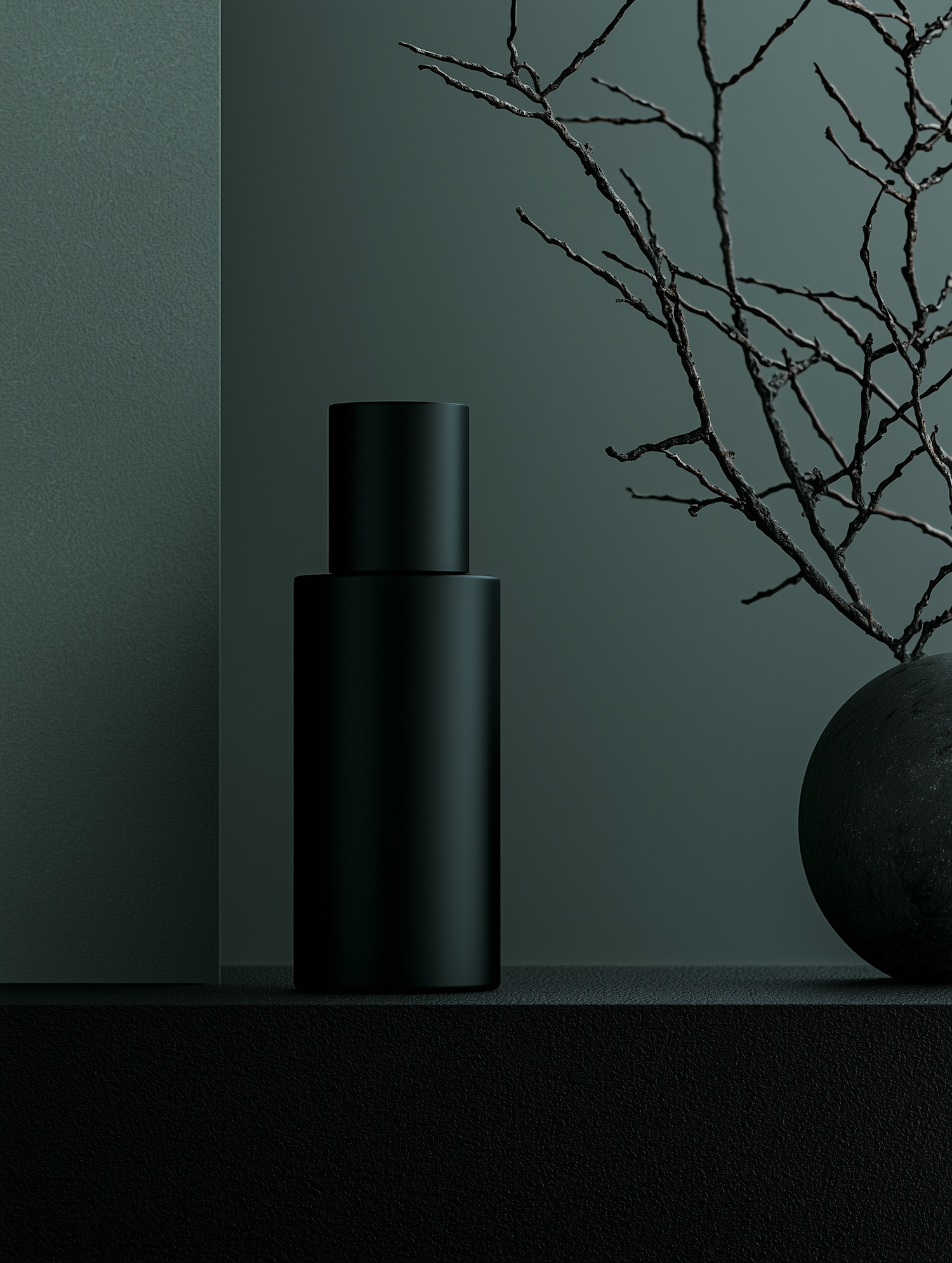Minimalist dark bottle and branches on a textured surface with a deep green background, creating a modern and elegant aesthetic.