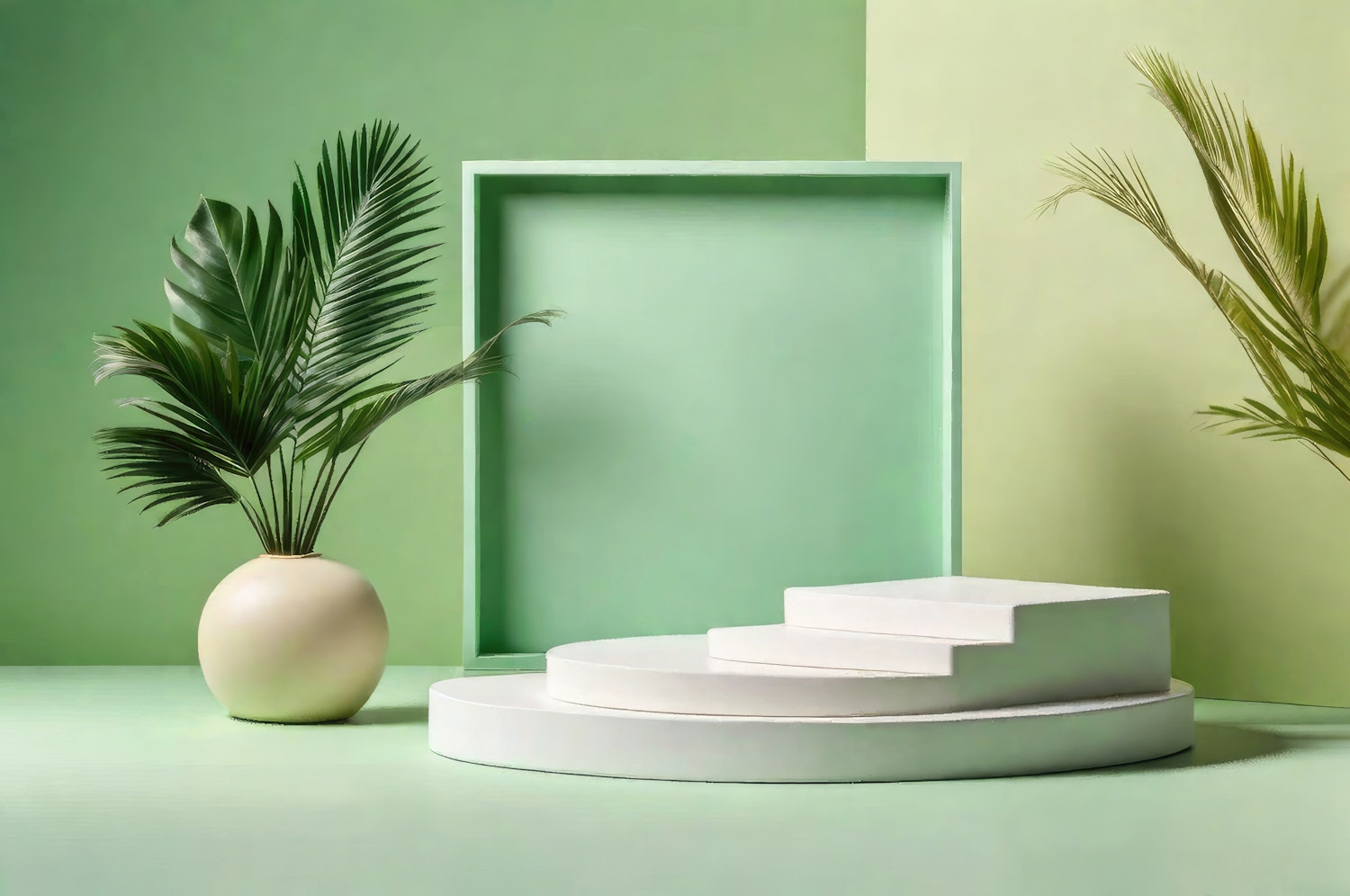 Minimalist green scene with palm leaves in a vase, white steps, and a geometric backdrop. Perfect for modern design inspiration.