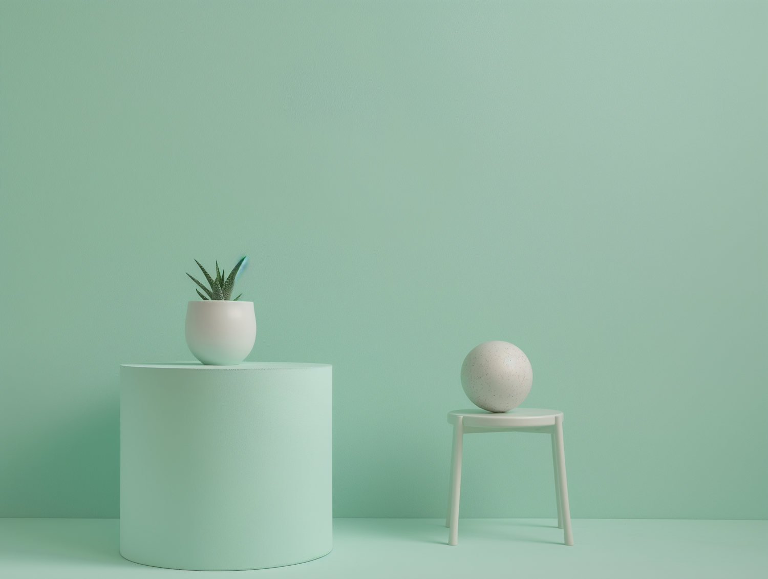 Minimalist scene with a succulent in a white pot on a pedestal and a speckled sphere on a stool, set against a pastel green background.
