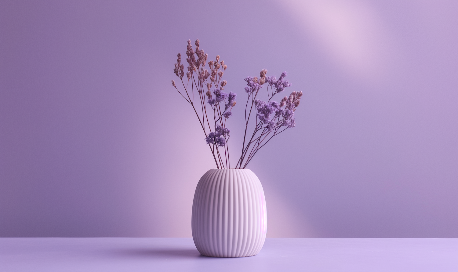 Elegant white vase with dried purple and beige flowers on a light purple background, creating a serene and minimalist aesthetic.