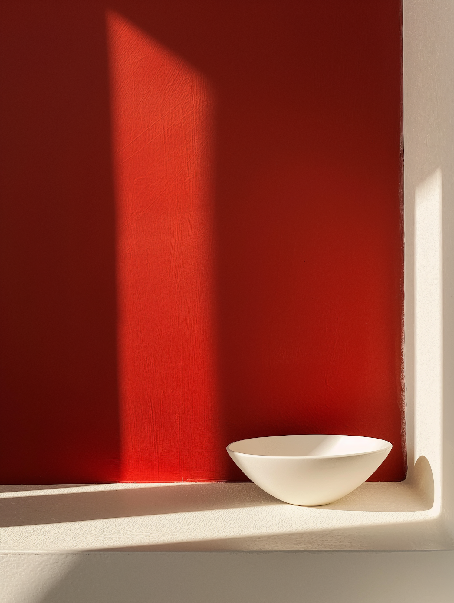 Minimalist scene with a white bowl on a ledge against a vibrant red wall, bathed in sunlight and shadows.