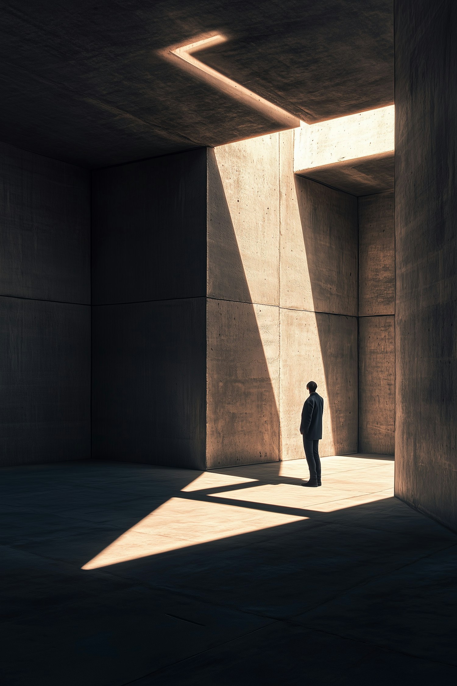 A lone figure in a dark suit stands in a minimalist concrete space, illuminated by dramatic light and shadows from geometric openings above.