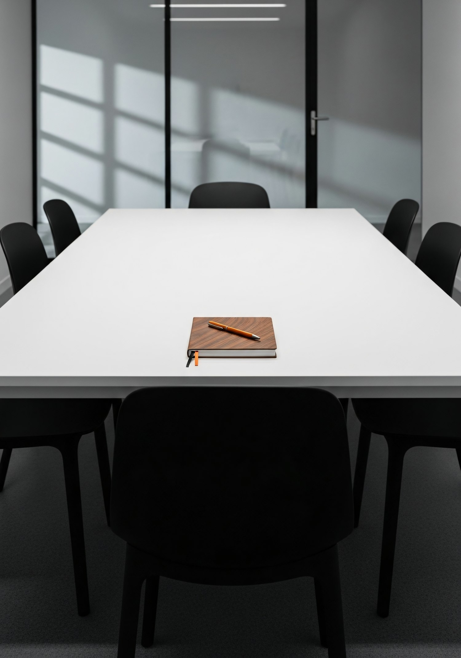 Minimalist conference room with a white table, black chairs, and a notebook with a pen, illuminated by soft natural light.