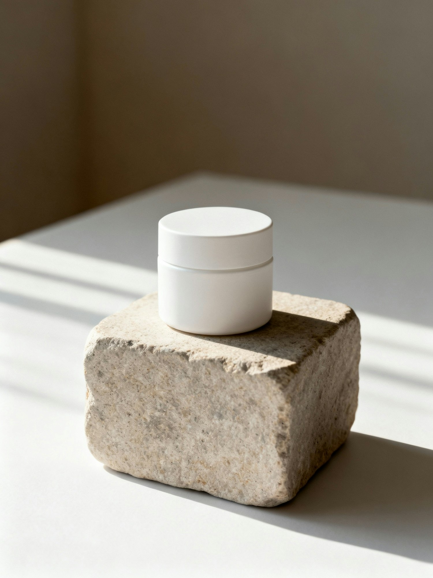 Minimalist mockup photography, soft natural daylight, clean and professional style, realistic textures, editorial look, warm neutral tones, shadows adding depth, no text, no design, white surfaces only. Small blank cosmetic jar placed on a stone block, subtle shadows, minimal and elegant atmosphere.